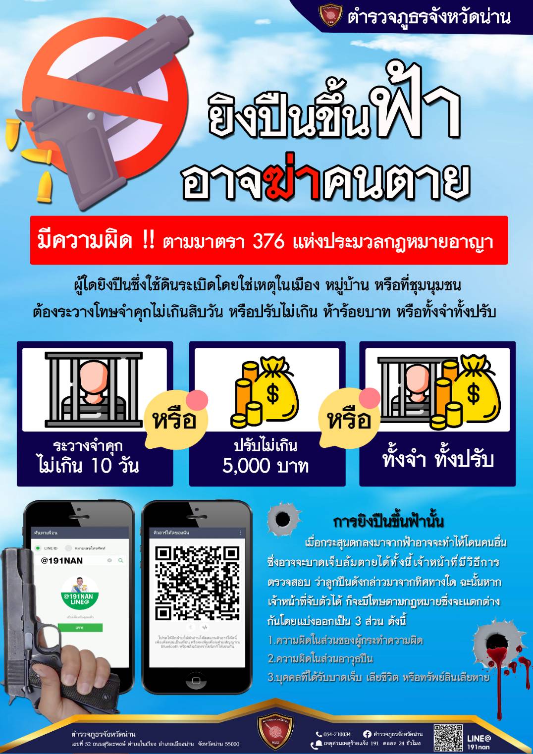 พล ต.ต.ปิยะพันธ์ ภัทรพงศ์สินธุ์ ผบก.ภ.จ.น่าน แจ้งเตือนไปยังประชาชน โดยเฉพาะในช่วงของเทศกาลปีใหม่ ประจำปี 2565 มักจะมีเหตุการณ์การยิงปืนขึ้นฟ้า ซึ่งกระสุนปืนที่ยิงออกไป อาจไปหล่นใส่บุคคลให้ได้รับอันตราย บางรายถึงขั้นเสียชีวิต หรือหล่นใส่หลังคาบ้านเรือนประชาชน จนได้รับความเสียหาย ซึ่งถือว่าเป็นความผิดและมีโทษตามกฎหมาย ตำรวจจะจับกุมและดำเนินการตามกฎหมายอย่างเด็ดขาด