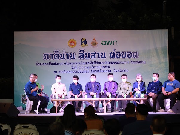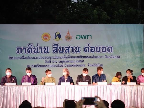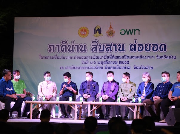 เมื่อวันที่ 5 พฤศจิกายน 2565 ที่ลานวัฒนธรรมข่วงน้อย อำเภอเมืองน่าน จังหวัดน่าน นายวิบูรณ์ แววบัณฑิต ผู้ว่าราชการจังหวัดน่าน เป็นประธานเปิดงาน “สืบสาน ต่อยอด กับปิดทองหลังพระฯ” เพื่อให้หมู่บ้านต้นแบบปิดทองหลังพระ สืบสานแนวพระราชดำริ ใน 3 อำเภอ ผู้ว่าราชการจังหวัดน่าน ผู้แทน สำนักงานเกษตรและสหกรณ์จังหวัดน่าน สำนักงานตรวจบัญชีสหกรณ์จังหวัดน่าน สำนักงานพาณิชย์จังหวัดน่าน องค์การบริหารส่วนตำบลศรีภูมิ องค์การบริหารส่วนตำบลตาลชุม องค์การบริหารส่วนตำบลขุนน่าน เทศบาลตำบลยอด มหาวิทยาลัยเทคโนโลยีราชมงคลล้านนา น่าน องค์การบริหารพัฒนาพื้นที่พิเศษเพื่อการท่องเที่ยวอย่างยั่งยืน และนายวีรเทพ พิรโรจน์ ผู้อำนวยการสถาบันส่งเสริมและพัฒนากิจกรรมปิดทองหลังพระ สืบสานแนวพระราชดำริ กล่าวรายงาน“