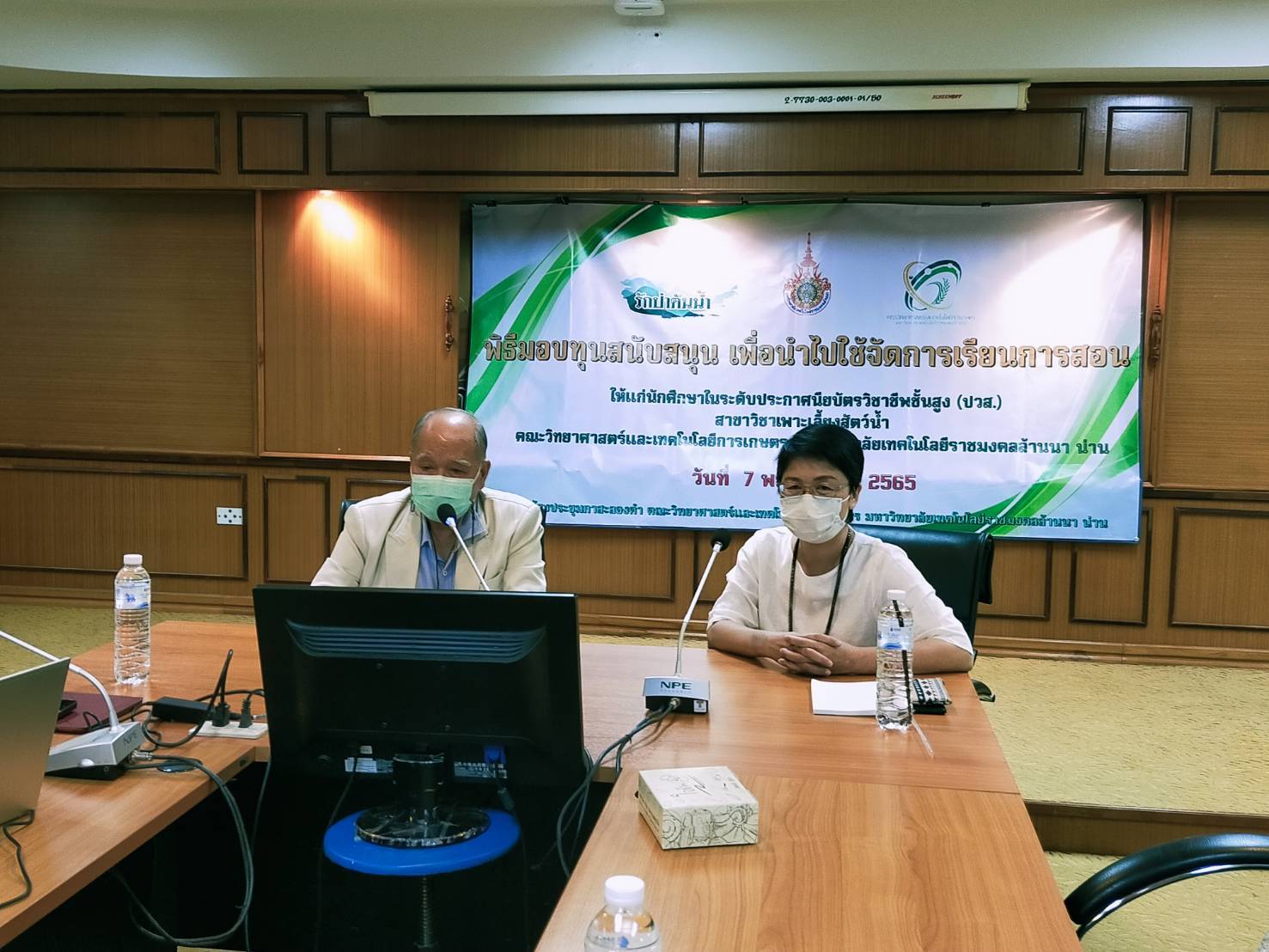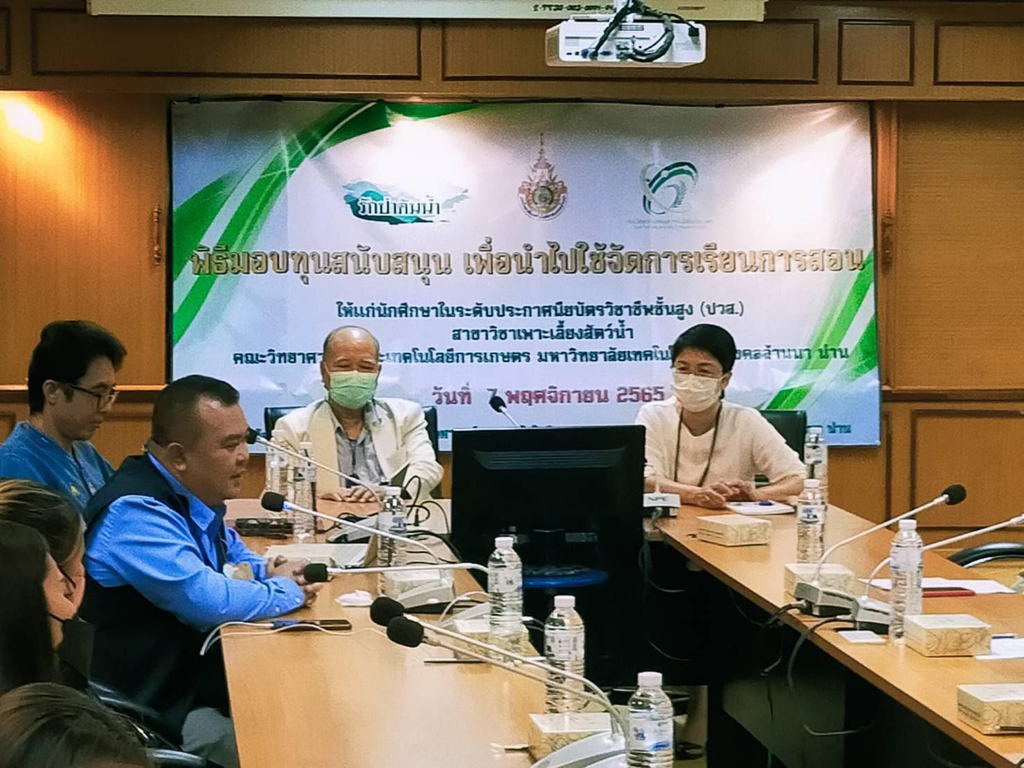 เมื่อวันที่ 7 พฤศจิกายน 2565 ณ ห้องประชุมชมพูภูคา กองบริหารทรัพยากรน่าน มหาวิทยาลัยเทคโนโลยีราชมงคลล้านนา น่าน กลุ่มรักป่าต้นน้ำ นำโดย ผศ.(พิเศษ)ปรีชา วุฒิการณ์ ประธานกลุ่ม “รักป่าต้นน้ำ” ได้เป็นประธานในการมอบทุนการศึกษา เพื่อนำไปใช้จัดการเรียนการสอน ให้แก่นักศึกษาในระดับประกาศนียบัตรวิชาชีพชั้นสูง (ปวส.) สาขาวิชาเพาะเลี้ยงสัตว์น้ำ คณะวิทยาศาสตร์และเทคโนโลยีการเกษตร มหาวิทยาลัยเทคโนโลยีราชมงคลล้านนา น่าน โดยมีนางนลัทพร คูหา ผู้อำนวยการกองการศึกษา มหาวิทยาลัยเทคโนโลยีราชมงคลล้านนา น่าน เป็นผู้กล่าวต้อนรับผู้เข้าร่วมกิจกรรม สืบเนื่องมาจาก ผศ.(พิเศษ)ปรีชา วุฒิการณ์ และเครือข่าย “รักป่าต้นน้ำ” ได้เล็งเห็นความสำคัญของทรัพยากรสัตว์น้ำ โดยพาะสัตว์น้ำภูเขา (ปลาหลายสายพันธุ์ ปูภูเขา กบภูเขา และหอย) ที่พบในเขตแม่น้ำลาธารของบ้านห้วยหาด บ้านหลักลาย ตำบลอวน อำเภอปัว จังหวัดน่าน ซึ่งเป็นเขตป่าต้นน้ำ จึงได้เกิดแนวคิดที่จะขยายพันธุ์สัตว์น้ำภูเขา เพื่อต่อยอดไปถึงการอนุรักษ์ป่าต้นน้ำควบคู่กันไปด้วย จึงนำมาสู่การสร้างหลักสูตรประมงชุมชน รับคนในชุมชนบ้านห้วยหาด บ้านหลักลาย เข้ามาเป็นนักศึกษาในระดับประกาศนียบัตรวิชาชีพชั้นสูง (ปวส.) จำนวน 11 คน