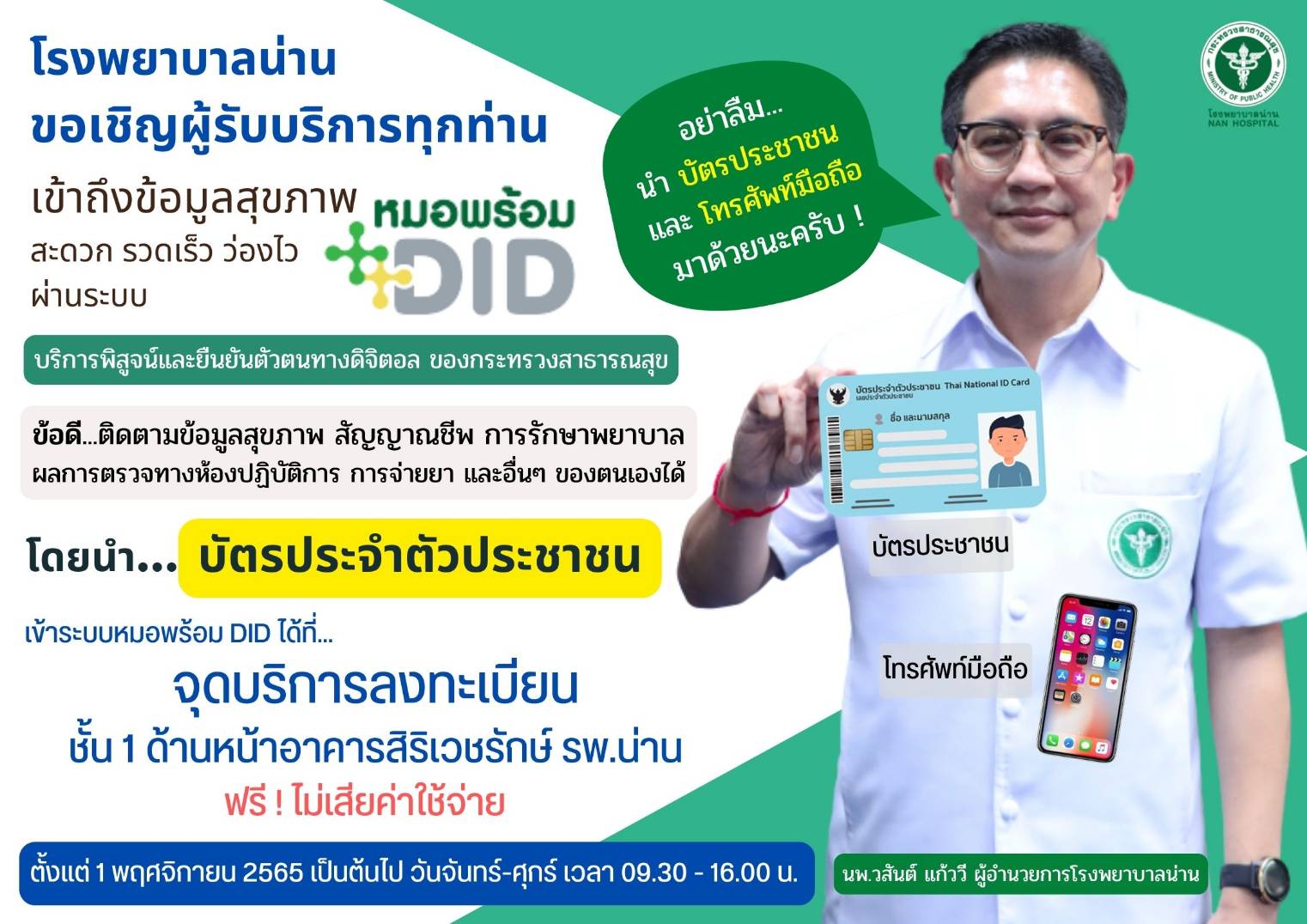 นพ.วสันต์ แก้ววี ผู้อำนวยการ โรงพยาบาลน่านโรงพยาบาลน่าน แจ้งว่า ขอเชิญผู้รับบริการทุกท่าน เข้าถึงข้อมูลสุขภาพ ที่สะดวก รวดเร็ว ว่องไว ผ่านระบบ DID (บริการพิสูจน์และยืนยันตัวตนทางดิจิตอล ของกระทรวงสาธารณสุข) ข้อดีไว้ติดตามข้อมูลสุขภาพ สัญญาณชีพ การรักษาพยาบาล ผลการตรวจทางห้องปฏิบัติการ การจ่ายยา และอื่นๆ ของตนเองได้ โดยนำบัตรประจำตัวประชาชน เข้าระบบหมอพร้อม DID ได้ที่จุดบริการลงทะเบียน ชั้น 1 ด้านหน้าอาคารสิริเวชรักษ์ รพ.น่าน