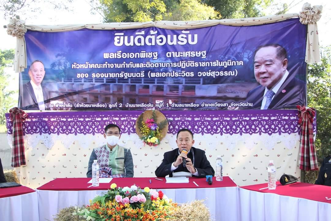 เมื่อวันที่ 20 ธันวาคม 2565 เวลา 14.00 น. พลเรือเอก พิเชฐ ตานะเศรษฐ หัวหน้าคณะทำงานกำกับและติดตามการปฏิบัติราชการในภูมิภาค ของรองนายกรัฐมนตรี (พลเอกประวิตร วงษ์สุวรรณ) และคณะ ลงพื้นติดตามความก้าวหน้าในการดำเนินโครงการ ที่ได้รับการสนับสนุนงบประมาณรายจ่าย ประจำปีงบประมาณ พ.ศ. 2565 เพื่อช่วยเหลือและบรรเทาความเดือดร้อนของพี่น้องประชาชน ในพื้นที่ตำบลนาเหลือง อำเภอเวียงสา จังหวัดน่าน โดยมี นายวิบูรณ์ แววบัณฑิต ผู้ว่าราชการจังหวัดน่าน พร้อมด้วยหัวหน้าส่วนราชการ องค์กรปกครองส่วนท้องถิ่น หน่วยงานที่เกี่ยวข้อง และประชาชนในพื้นที่ให้การต้อนรับ