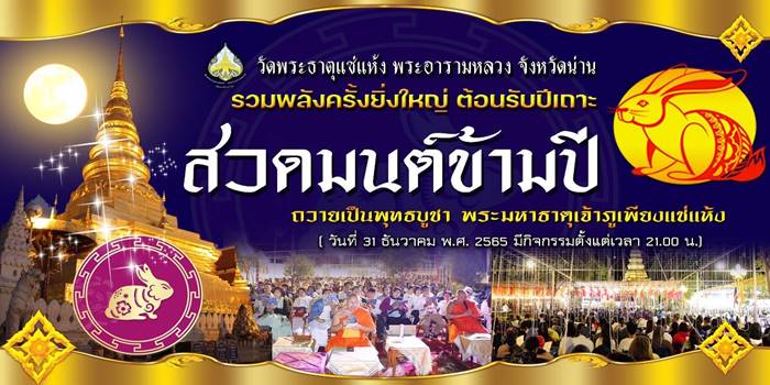 ขณะที่ทางวัด พระสงฆ์ และ สามเณร ต่างกำลังเตรียมจัดพื้นที่งาน เพื่อสวดมนต์ข้ามปี ในคืนวันที่ 31 ธันวาคม 2565 ตั้งแต่เวลา 21.00 น.-00.09 น. และร่วมทำบุญตักบาตร วันขึ้นปีใหม่ วันที่ 1 มกราคม 2566 ตั้งแต่เวลา 07.00 น. เป็นต้นไป ณ ลานต้นโพธิ์ วัดพระธาตุแช่แห้ง พระอารามหลวง