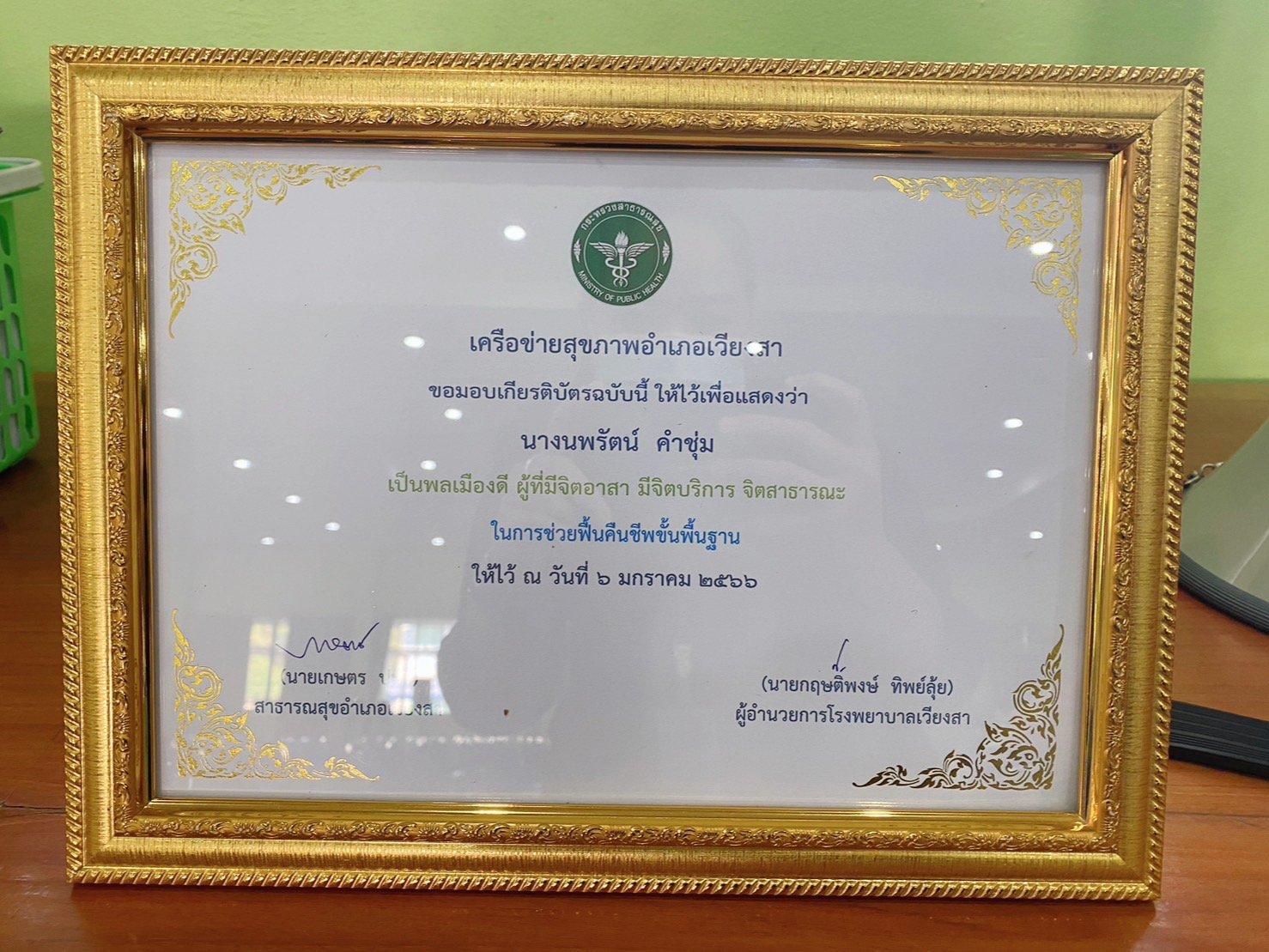 จากการสอบถามทางเจ้าหน้าที่ อาสาสมัครสาธารณสุขประจำหมู่บ้านที่เข้าทำการช่วยเหลือปั้มหัวใจและได้กระทำความดีในครั้งนี้ ทราบชื่อคือ นางนพรัตน์ คำชุ่ม หมู่ที่ 7 ตำบลกลางเวียง อำเภอเวียงสา จังหวัดน่าน เจ้าหน้าที่อาสาสมัครสาธารณสุขประจำหมู่บ้าน บ้านดอนไชย ในเขตรับผิดชอบของโรงพยาบาลเวียงสา โดยทางกลุ่มเพื่อนร่วมรุ่นศิษย์เก่าเกษตรน่านของผู้ป่วย ได้ชื่นชมการกระทำความดีในครั้งนี้ และถือว่าเป็นผู้ที่ที่มีจิตอาสา มีจิตสำนึก มีจิตบริการ เป็นพลเมืองดีไม่ละเลยต่อหน้าที่ และเป็นแบบอย่างที่ดีต่อหลานชายในความมีน้ำใจ มีจิตสาธารณะ ทำให้สามารถช่วยชีวิตผู้ป่วยได้ จากเหตุการณ์ในครั้งนี้ นอกจากการกู้ชีพผู้ป่วยให้พ้นจากวิกฤตแล้ว ยังทำให้สามารถไปร่วมงานมงคลสมรสของลูกชายได้อีกด้วย ทางสมาคมศิษย์เก่ามหาวิทยาลัยเทศโนโลยีราชมงคลล้านนา น่าน (เกษตรน่าน) และเครือข่ายสุภาพอำเภอเวียงสา จึงได้มอบเกียรติบัตร เชิดชูเกียรติ และมอบเงินจำนวนหนึ่งให้กับ “คนดี ศรีเวียงสา” เพื่อเป็นการขอบคุณที่ได้กระทำความดีในครั้งนี้ด้วย
