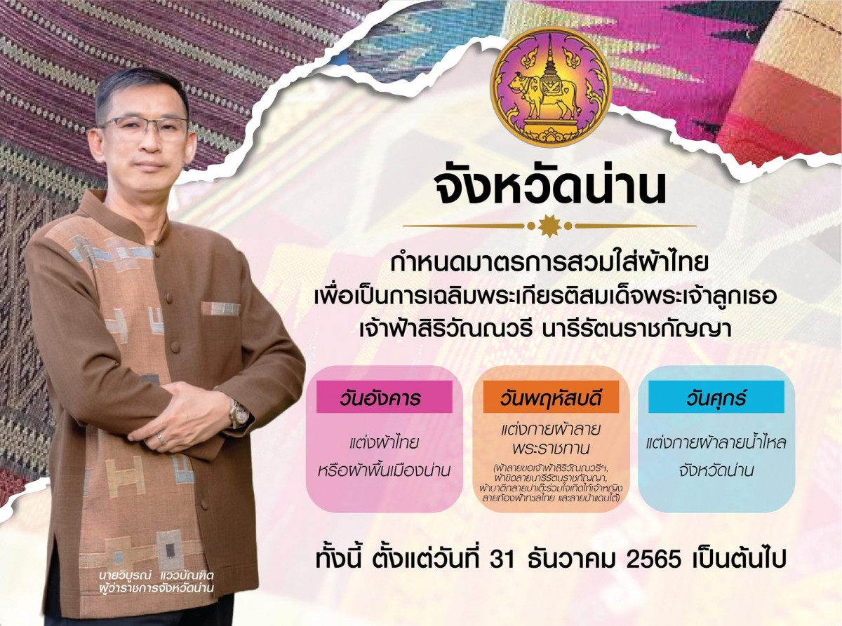 สำหรับบันทึกความร่วมมือ (MOU) การสวมใส่ผ้าไทย/ผ้าพื้นเมืองน่าน กับหน่วยงาน องค์กรในพื้นที่จังหวัดน่าน มีวัตถุประสงค์ เพื่อสนองพระดำริสมเด็จพระเจ้าลูกเธอ เจ้าฟ้าสิริวัณณวรี นารีรัตนราชกัญญา ในการสืบสานพระราชปณิธาน สมเด็จพระนางเจ้าสิริกิติ์ พระบรมราชินีนาถ พระบรมราชชนนีพันปีหลวง ในการอนุรักษ์ผ้าไทย และเพื่ออนุรักษ์ สืบสาน พัฒนาต่อยอดผ้าน่าน และสร้างกระแสการสวมใส่ผ้าพื้นเมืองน่านให้เกิดความต่อเนื่อง เพื่อกระตุ้นรายได้สู่กลุ่มอาชีพในชุมชน โดยจังหวัดน่านได้ส่งเสริมและสนับสนุนให้บุคลากรในสังกัดใช้และสวมใส่ผ้าพื้นเมือง โดยร่วมกันแต่งกายผ้าไทยหรือผ้าพื้นเมืองน่านในวันอังคาร และในวันพฤหัสบดี แต่งกายผ้าลายพระราชทาน (ผ้าลายขอเจ้าฟ้าสิริวัณณวรีฯ ผ้าขิดลายนารีรัตน-ราชกัญญา หรือผ้าบาติกลายปาเต๊ะร่วมใจเทิดไท้เจ้าหญิง ลายท้องทะเลไทยและลายป่าแดนใต้) ส่วนในวันศุกร์แต่งกายผ้าลายน้ำไหล จังหวัดน่าน