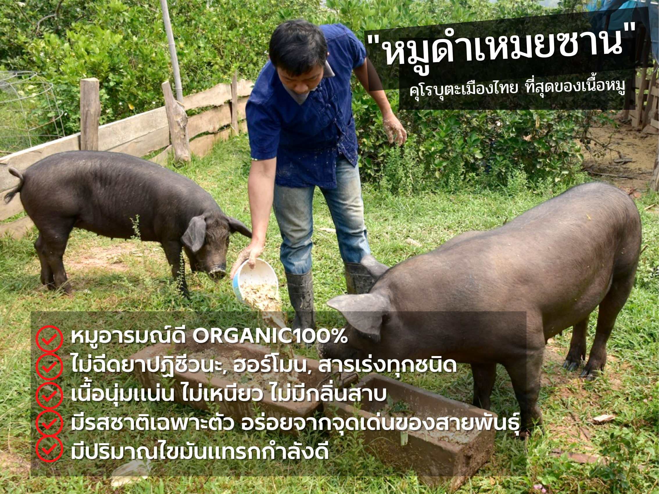 ก็เลยเริ่มทดลองโดยการไปหาหมูดำพันธุ์เหมยซานจาก อ.เชียงคำ จ.พะเยา ได้มาทั้งหมด 7-8 ตัว มาแบ่งกันเลี้ยง 7 คน เริ่มแรกยังเลี้ยงด้วยอาหารเม็ด แต่ต่อมาได้ลองผิดลองถูกโดยการเลี้ยงด้วยอาหารอินทรีย์ ปรากฏว่าหมูออกลูกดก เนื้อหมูมีรสชาดดีขึ้น แต่ก็ยังไม่เป็นที่นิยมของท้องตลาด มีแค่ชาวเขาซื้อไปประกอบในพิธีกรรมต่างๆ จึงมีแนวคิดจะพัฒนาสายพันธ์ุให้เป็นพันธ์ุเนื้อ ให้เทียบเท่ากับหมูดำคุโรบุตะของญี่ปุ่น