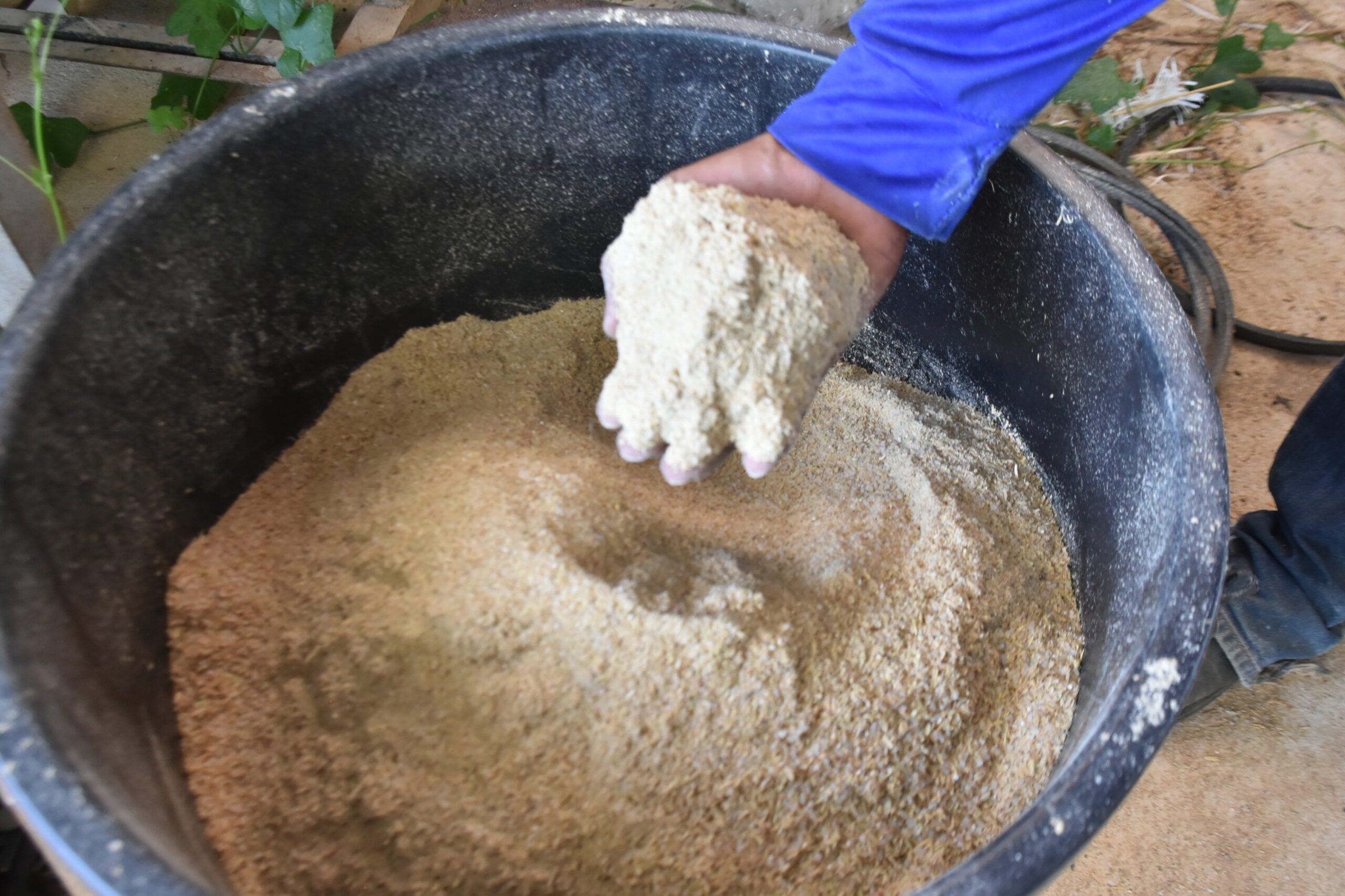 อาหารที่ใช้เลี้ยงหมูดำของกลุ่มฯ จะใช้ข้าวอินทรีย์ที่ปลูกโดยไม่ใช้สารเคมี บดรวมกับหัวปลาและก้างปลานิลตากแห้ง ซึ่งเป็นหนึ่งในผลิตภัณฑ์ของกลุ่ม โดยให้ทานสลับกับหยวกกล้วยและหญ้าเนเปียร์ที่ปลูกเอง จะไม่มีการใช้อาหารเม็ด