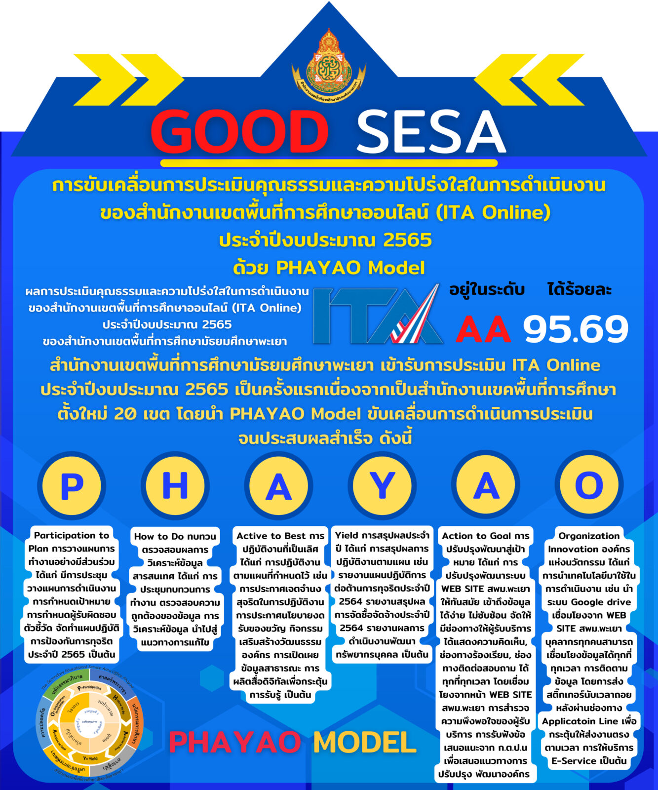 สำนักงานเขตพื้นที่การศึกษามัธยมศึกษาพะเยา เข้ารับการประเมินประเมินคุณธรรมและความโปร่งใส ในการดำเนินงานของสำนักงานเขตพื้นที่การศึกษาออนไลน์ (ITA Online) ประจำปีงบประมาณ 2565 จากคณะกรรมการการศึกษาขั้นพื้นฐาน เป็นครั้งแรกเนื่องจากเป็นสำนักงานเขตพื้นที่การศึกษาตั้งใหม่ 20 เขต โดยนำ PHAYAO Model ขับเคลื่อนการดำเนินการประเมิน จนประสบผลสำเร็จ ดังนี้ อยู่ในระดับ AA ได้คะแนนร้อยละ 95.69