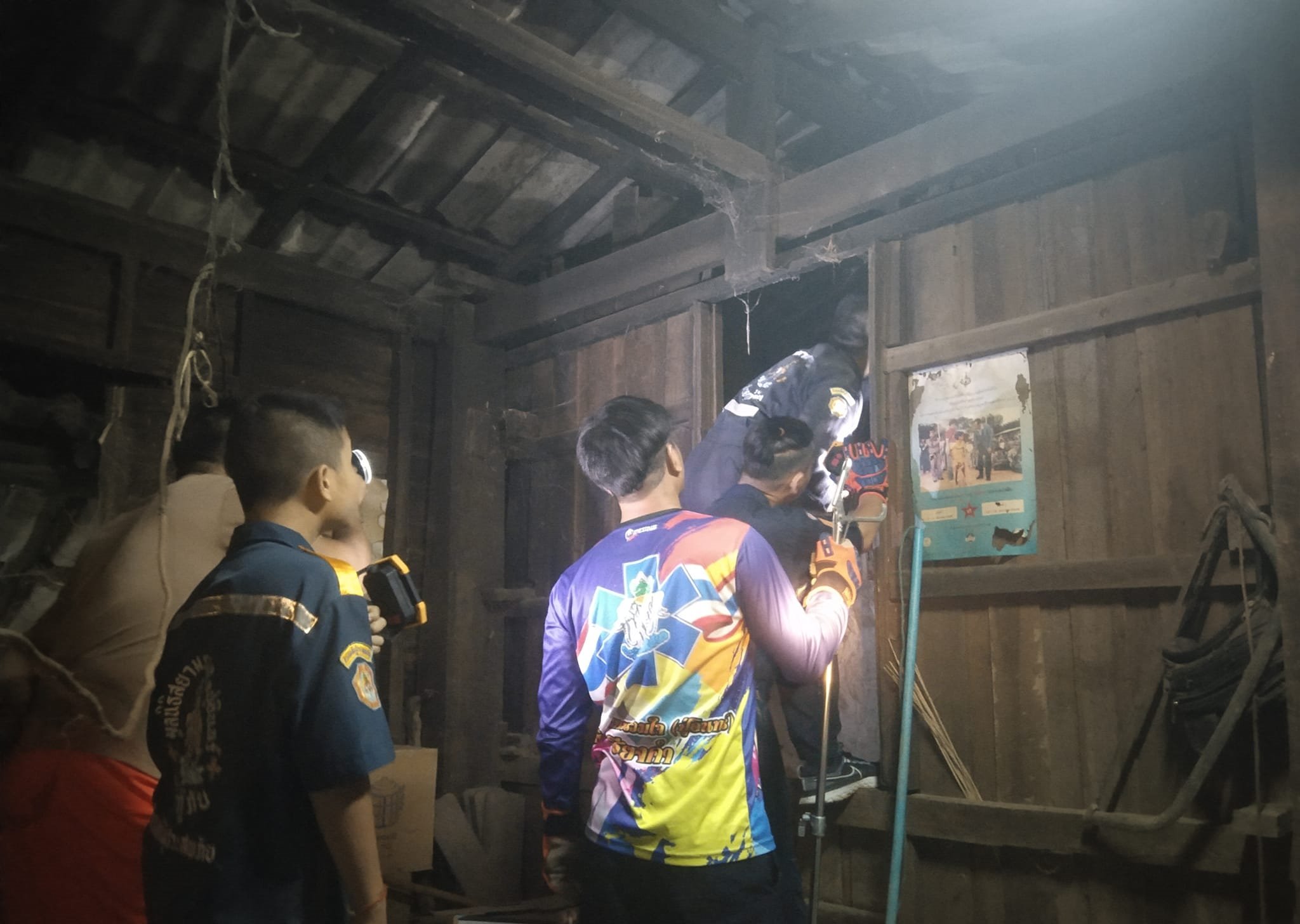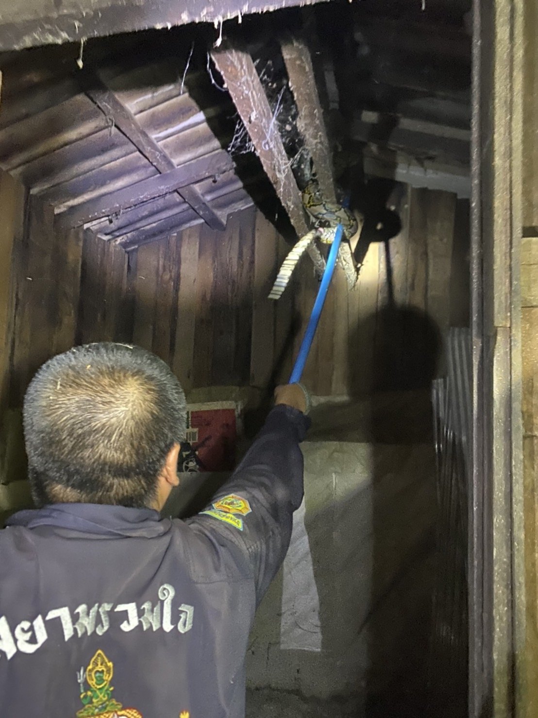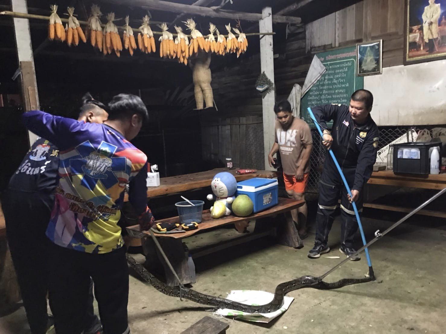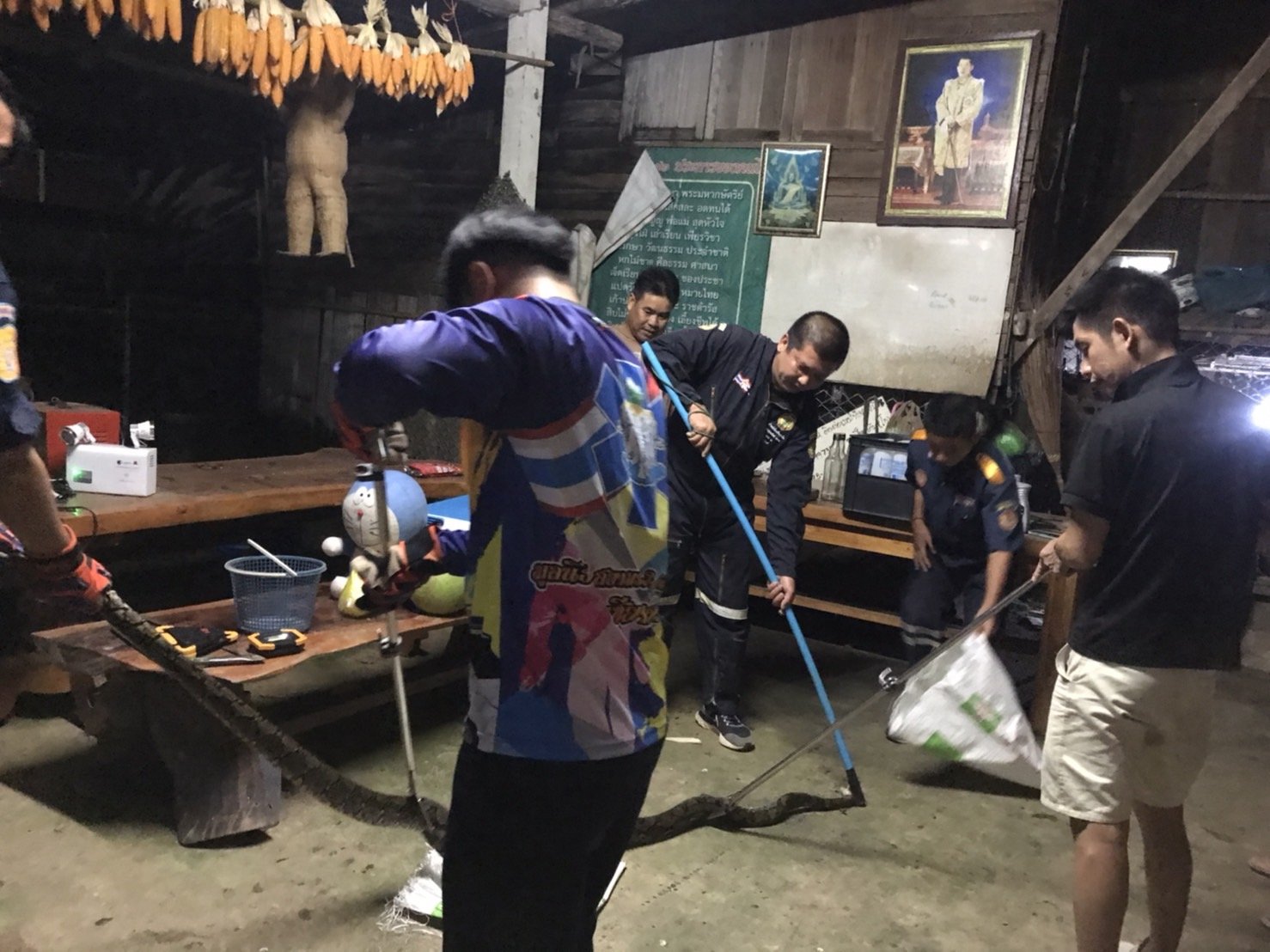 เมื่อเวลา 01.00 น. กลางดึกวันที่ 3 ต.ค. 65 ทางเจ้าหน้าที่กู้ภัยมูลนิธิสยามรวมใจจุดเชียงคำ จ.พะเยา ได้รับแจ้งจากนายมิตร สองสีใส ผู้ใหญ่บ้านเปื๋อยเปียง บ้าน ม.14 ต.หย่วน อ.เชียงคำ จ.พะเยา ว่าพบงูเหลือมยักษ์กำลังเขมือบไก่ในเล้าและนอนขดอยู่ในยุ้งข้าวหลังบ้าน ทั้งนี้ทางเจ้าหน้าที่กู้ภัยพร้อมกำลังพล 5-6 นายและเครื่องมือจับงูจึงได้รุดไปยังพื้นที่เกิดเหตุทันที