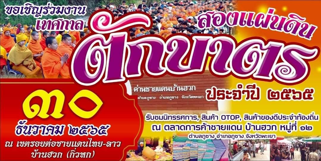 วันที่ 13 ธ.ค. 65 ผู้สื่อข่าวรายงานว่า จ.พะเยา โดย อ.ภูซางเตรียมจัดงานเทศกาลตักบาตรสองแผ่นดิน ประจำปี 2565 ขึ้นในวันที่ 30 ธ.ค. 65 ณ บริเวณรอยต่อชายแดนไทย-ลาว บ้านฮวก (กิ่วหก) ต.บ้านฮวก อ.ภูซาง จ.พะเยา ซึ่งประเพณีการตักบาตรสองแผ่นดิน เป็นประเพณีที่ทาง จ.พะเยา และแขวงไชยะบุรี ได้ยึดถือปฏิบัติกันมาอย่างต่อเนื่อง เพื่ออนุรักษ์ประเพณีวัฒนธรรมที่ดีงามให้คงอยู่ และส่งเสริมความสัมพันธ์ไทย-ลาว ระหว่างชาวบ้าน อ.ภูซาง จ.พะเยา และเมืองคอบ แขวงไชยะบุรี ให้แน่นแฟ้นยิ่งขึ้น อีกทั้งยังเป็นการประชาสัมพันธ์การค้าชายแดน และแหล่งท่องเที่ยวบ้านฮวก อ.ภูซางให้เป็นที่รู้จักอย่างกว้างขวางแพร่หลายมากยิ่งขึ้น