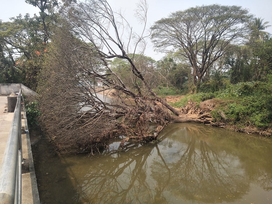 ลุงประสิทธิ์ สุขใหญ่อายุ 67 ปี ชาวบ้านฝั่งหมิ่นเล่าว่า ต้นจามจุรีหรือต้นฉำฉาอายุกว่า 70 ปี ตั้งแต่น้ำท่วมที่ผ่านมาถูกน้ำเซาะทรุดล้มขวางลำน้ำ ซึ่งชาวบ้านที่นี่ได้แจ้งไปยังหน่วยงานที่เกี่ยวข้อง ทั้งประมงน้ำจืดพะเยา กรมชลประทานพะเยา และหน่วยงานที่เกี่ยวข้องก็ไม่เห็นมาทำอะไร ชาวบ้านที่มีอาชีพหาปลาลำน้ำแห่งนี้ ไม่สามารถนำเรือออกหาปลาได้เหมือนแต่ก่อน เนื่องจากต้นไม่ขวางลำน้ำไม่สามารถนำเรือผ่านไปได้เหมือนแต่ก่อน วอนหน่วยงานที่เกี่ยวข้องเข้ามาดู และหาแนวทางแก้ไขต่อไป