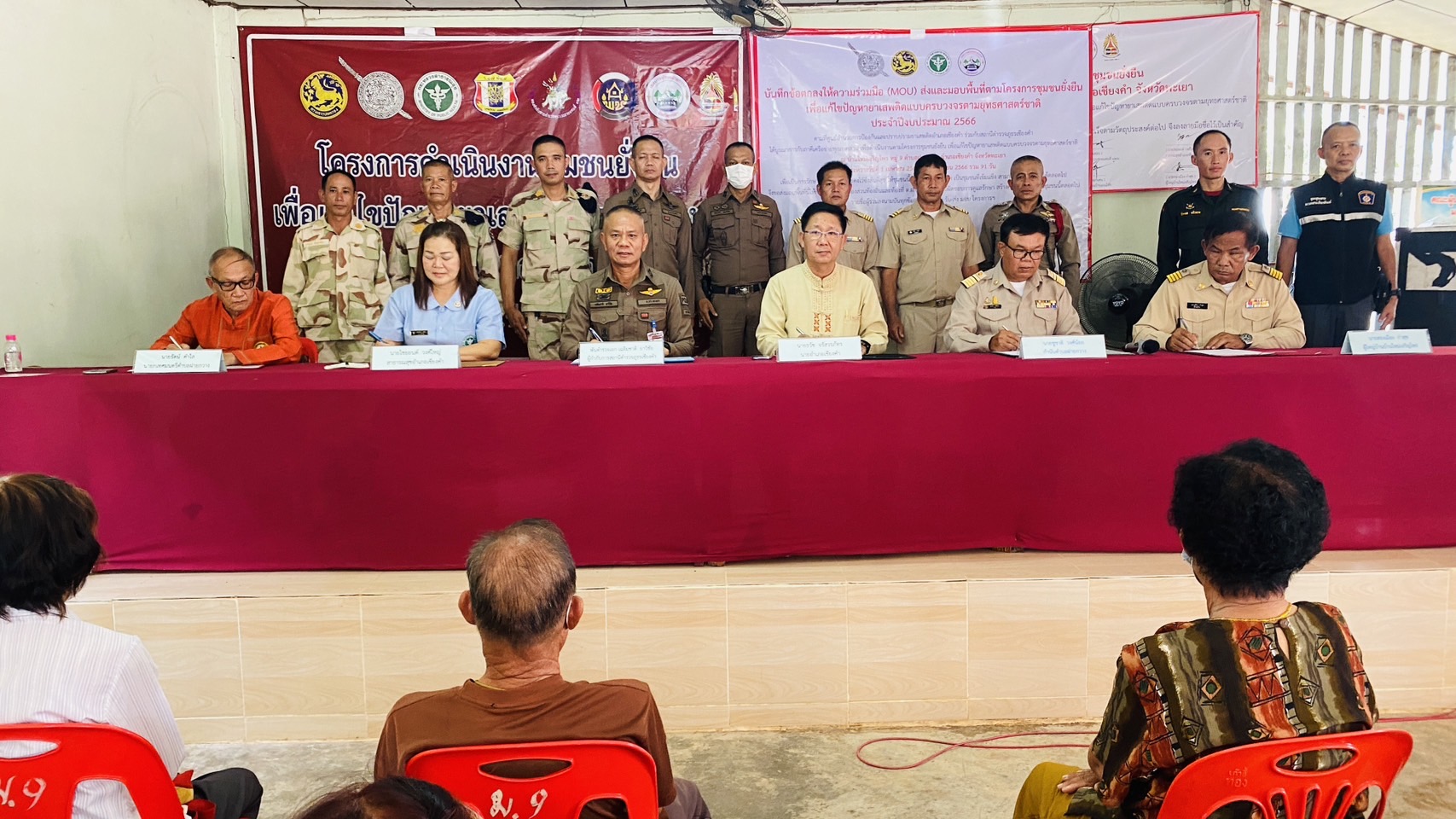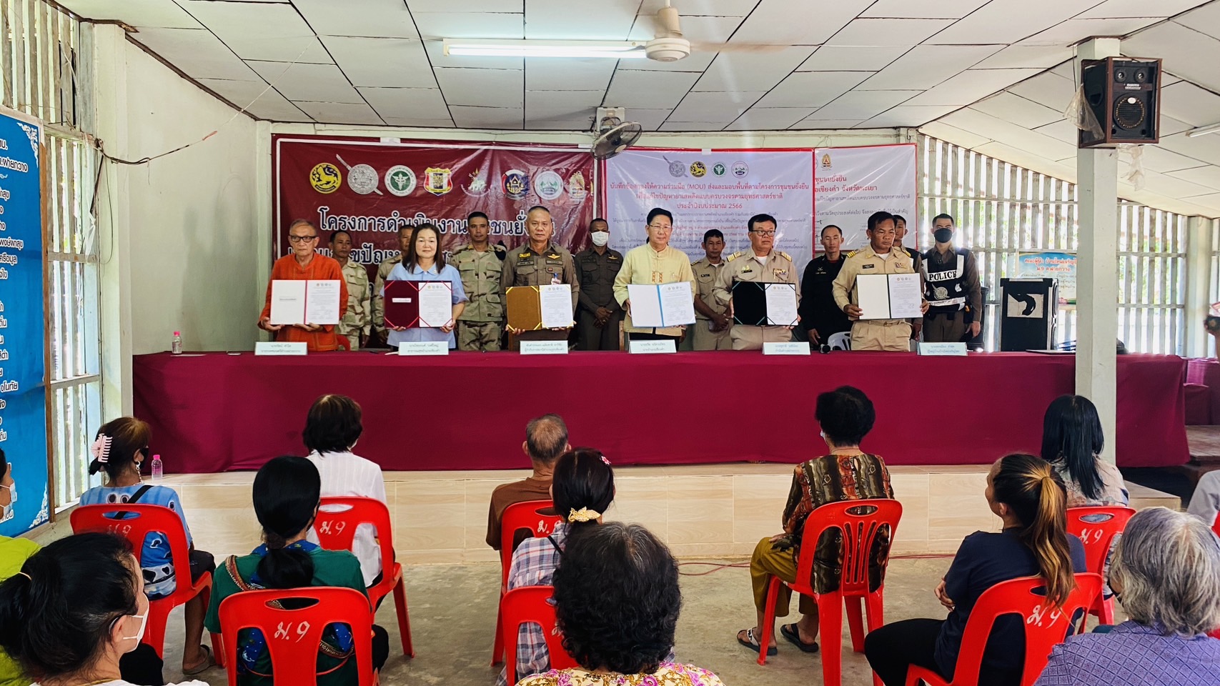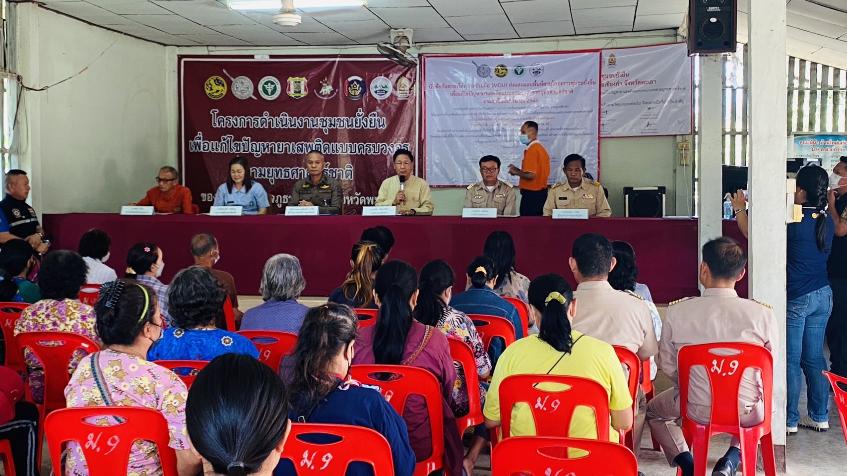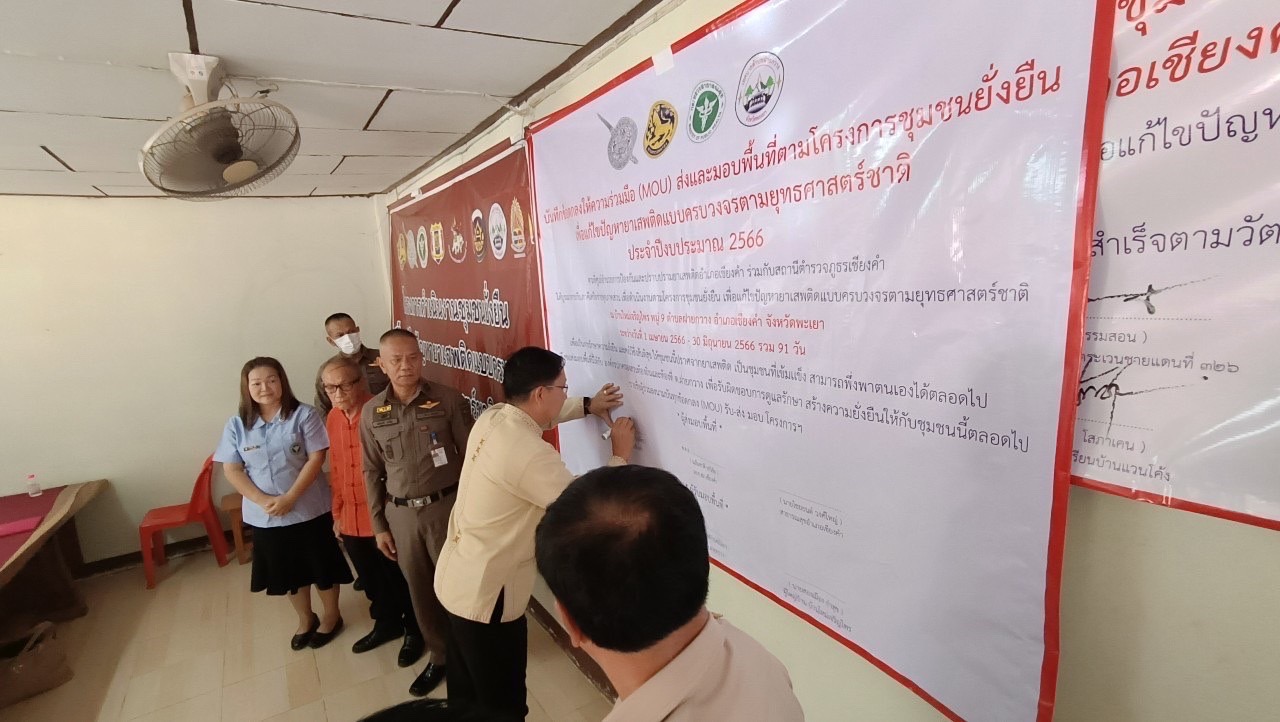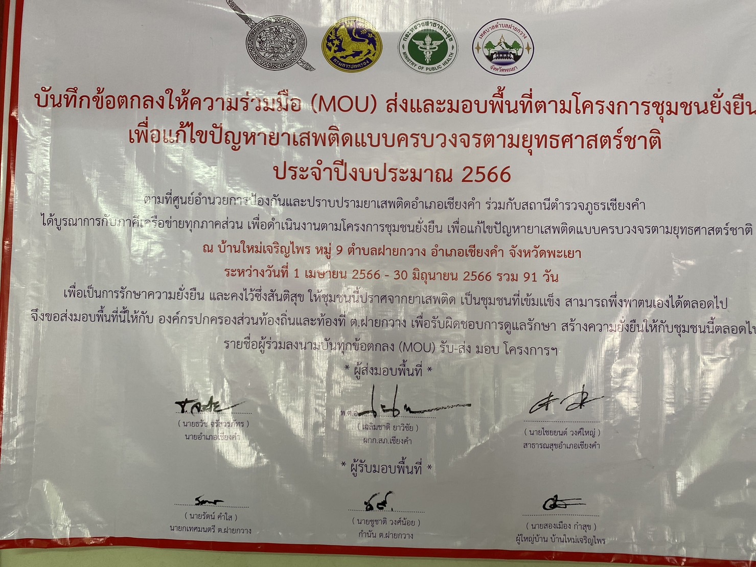 เมื่อวันที่ 4 ก.ค.66 ผู้สื่อข่าวรายงานว่า ภายในหอประชุมของบ้านใหม่เจริญไพร ม.9 ต.ฝายกวาง อ.เชียงคำ จ.พะเยา ได้มีการจัดกิจกรรมผ้าป่าระดมทุนจัดซื้อกล้องวงจรปิดติดตั้งภายในหมู่บ้านรวมทั้งการทำข้อตกลง MOU ในเรื่องของการร่วมมือขจัดปัญหายาเสพติดให้หมดไปจากพื้นที่ โดยการลงนามครั้งนี้ทางนายธวัช จรัสวรภัทร นายอำเภอเชียงคำ พ.ต.อ.เฉลิมชาติ ยาวิชัย ผกก.สภ.เชียงคำ เจ้าหน้าที่จาก รพ.สต.แวนโค้ง กำนัน ต.ฝายกวางและนายก ทต.ฝายกวาง ได้พร้อมใจกันลงนามเพื่อร่วมมือในการขัดปัญหายาเสพติดไปพร้อม ๆ กัน