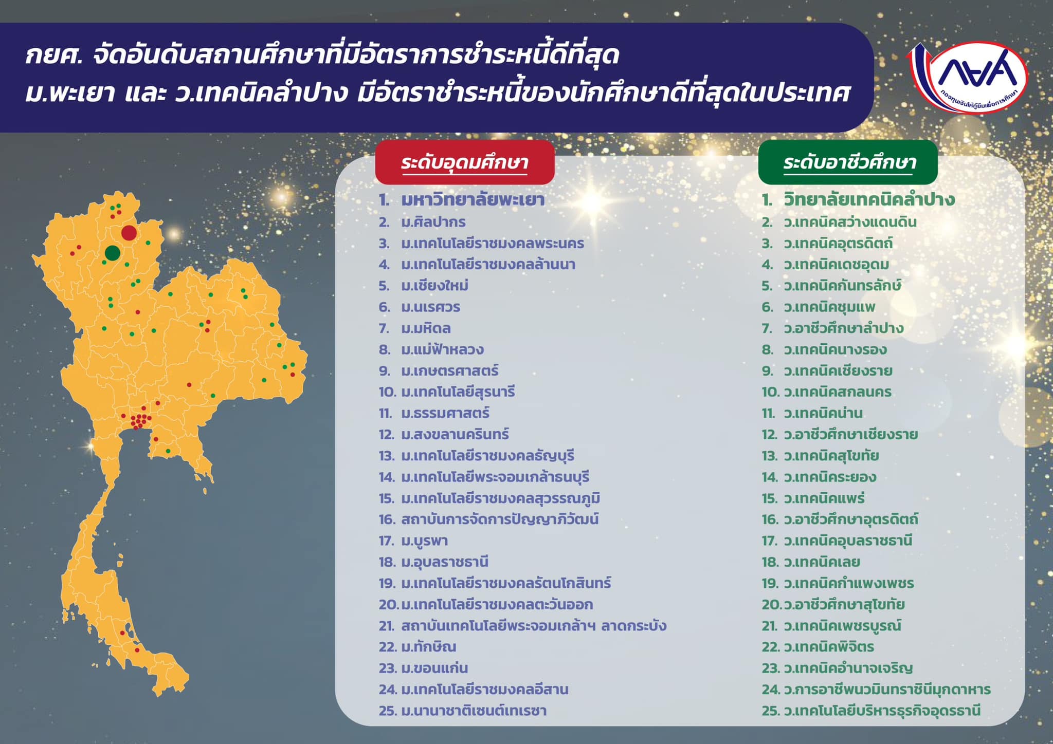 กยศ. จัดอันดับสถานศึกษาที่มีอัตราการชำระหนี้ดีที่สุด ม.พะเยา และ ว.เทคนิคลำปาง มีอัตราชำระหนี้ของนักศึกษาดีที่สุดในประเทศ