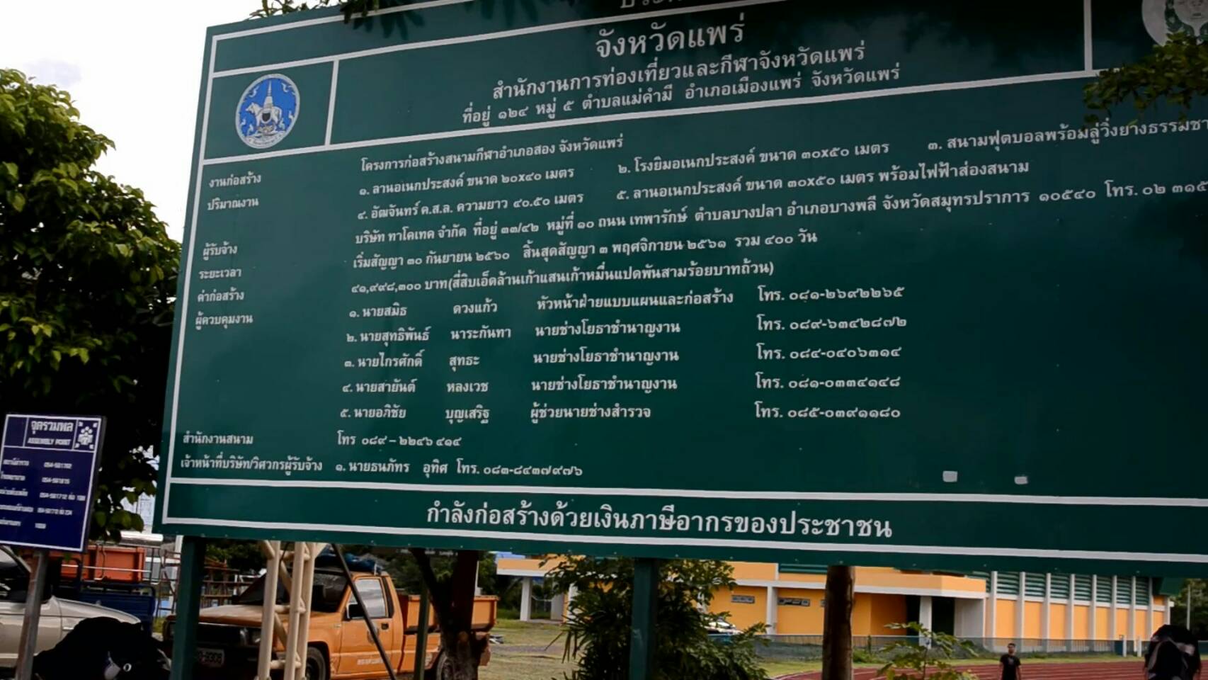นายนฤพนธ์ เล่าว่า ตนเองก็ได้รับการร้องเรียนจากชาวบ้านในอำเภอสองมาหลายครั้ง ก็ไม่รู้จะทำอย่างไร เพราะว่าโครงการนี้เป็นโครงการของสำนักงานการท่องเที่ยวและกีฬาจังหวัดแพร่ สร้างด้วยงบ 41,998,300 บาท (สี่สิบเอ็ดล้านเก้าแสนเก้าหมื่นแปดพันสามร้อยบาทถ้วน) ในจำนวนงบประมาณนี้ มี 1 ลานเอนกประสงค์ ขนาด 20+40 เมตร 2 โรงยิมเอนกประสงค์ ขนาด 30+50 เมตร 3 สนามฟุตบอล –ลู่วิ่ง 4 อัฒจันทร์ ความยาว 40+50 เมตร 5 ลานเอนกประสงค์ ขนาด 10+50 เมตร พร้อมไฟแสงสว่างแต่ปรากฏว่าไม่มีไฟฟ้าใช้