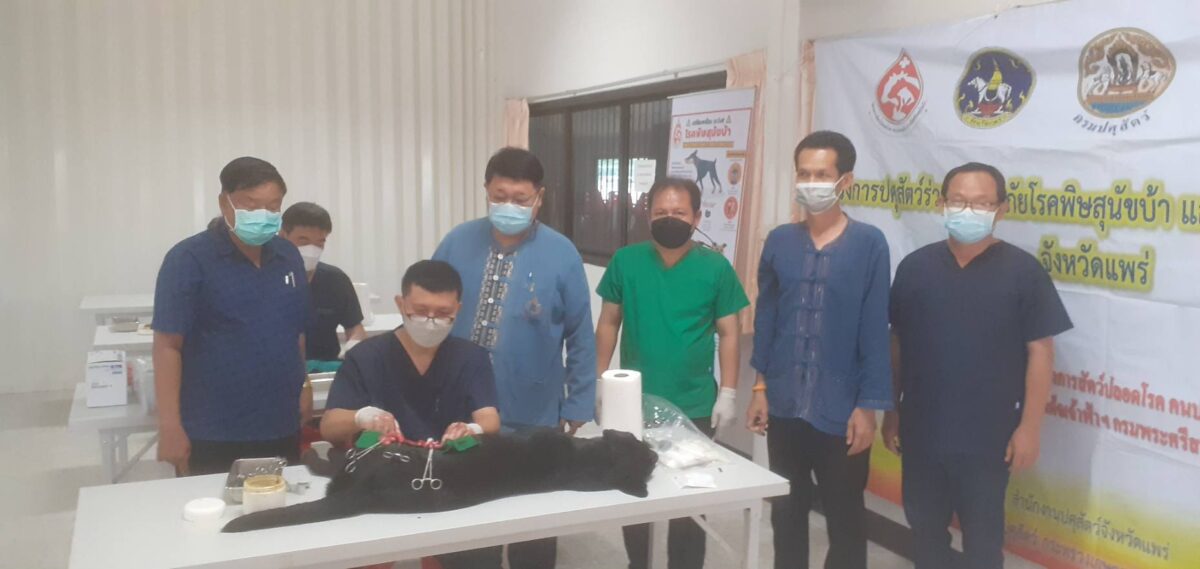 พร้อมด้วยพนักงานและเจ้าหน้าที่กลุ่มพัฒนาสุขภาพสัตว์ และสำนักงานปศุสัตว์อำเภอสอง เมืองแพร่ร้องกวาง สูงเม่น และหนองม่วงไข่ จังหวัดแพร่ บูรณาการร่วมกับองค์การบริหารส่วนตำบลท่าข้าม อำเภอเมืองแพร่ ปฏิบัติงานกิจกรรมควบคุมประชากรสุนัข แมว โดยการผ่าตัดทำหมันถาวร ตามโครงการปศุสัตว์ร่วมใจกำจัดภัยโรคพิษสุนัขบ้า ปี 2565 ภายใต้โครงการสัตว์ปลอดโรค คนปลอดภัยจากโรคพิษสุนัขบ้าตามพระปณิธาน ศาสตราจารย์ ดร.สมเด็จเจ้าฟ้าฯ กรมพระศรีสวางควัฒน วรขัตติยะราชนารี