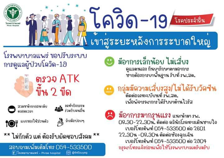 ผู้สื่อข่าวรายงานว่า จากการที่กระทรวงสาธารณสุขกำหนดให้โรคโควิด-19 เป็นโรคประจำถิ่น ดังนั้น ตั้งแต่วันที่ 1กรกฎาคม 2565,เป็นต้นไป โรงพยาบาลแพร่ ขอปรับระบบการดูแลผู้ป่วยโควิด-19 ผู้ป่วยที่จะไปยัง รพ.แพร่ จะทำอย่างไร ขอให้ให้ปฏิบัติตนดังนี้