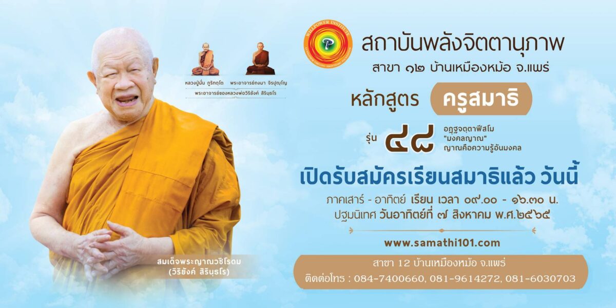 ผู้สื่อข่าวได้รับแจ้งว่าสถาบันพลังจิตตานุภาพสาขา 12 บ้านเหมืองหม้อ เปิดรับสมัครเรียนหลักสูตรครูสมาธิรุ่นที่ 48 (อฏฺฐจตฺตาฬีสโม) “มงคลญาณ” ญาณคือความรู้อันมงคล เปิดรับสมัครตั้งแต่บัดนี้ถึงวันที่ 7 สิงหาคม 2565