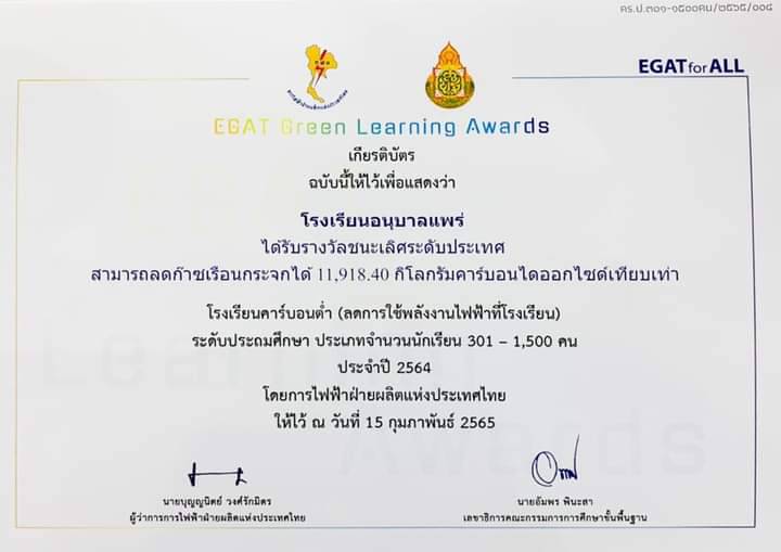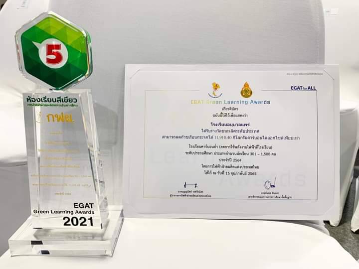 เมื่อวันที่ 15 สิงหาคม 2565 โรงเรียนอนุบาลแพร่ สพป.แพร่ เขต 1 นำโดย นายวิทูรย์ สินธุวงศ์ ผู้อำนวยการโรงเรียนฯ นางสุภัทรา ศรีระวัตร รองผู้อำนวยการ บริหารงานวิชาการและบริหารงานบุคคล และนางชลพิณทุ์ พัฒนสารินทร์ เข้ารับโล่และเกียรติบัตร รางวัลชนะเลิศ ระดับประเทศ โรงเรียนคาร์บอนต่ำ (ลดการใช้พลังงานไฟฟ้าที่โรงเรียน) ระดับประถมศึกษา ประเภทจำนวนนักเรียน 301 – 1,500 คน ประจำปี 2564 โดยการไฟฟ้าฝ่ายผลิตแห่งประเทศไทย ณ อิมแพคอารีน่า เมืองทองธานี