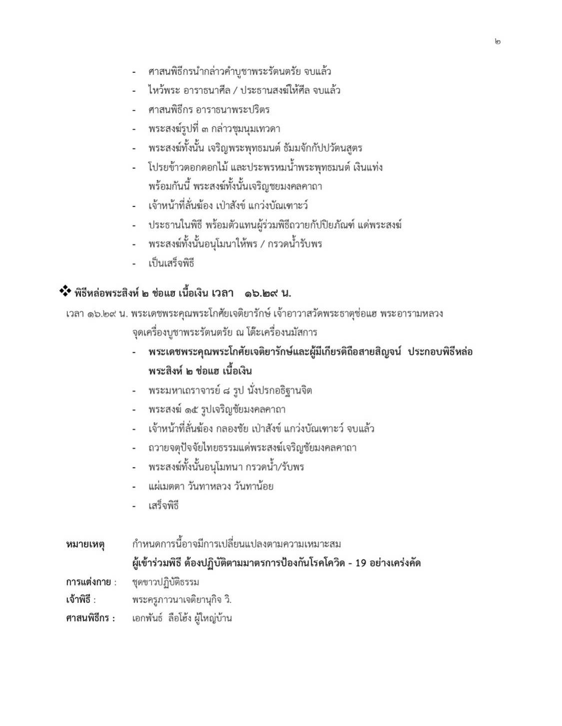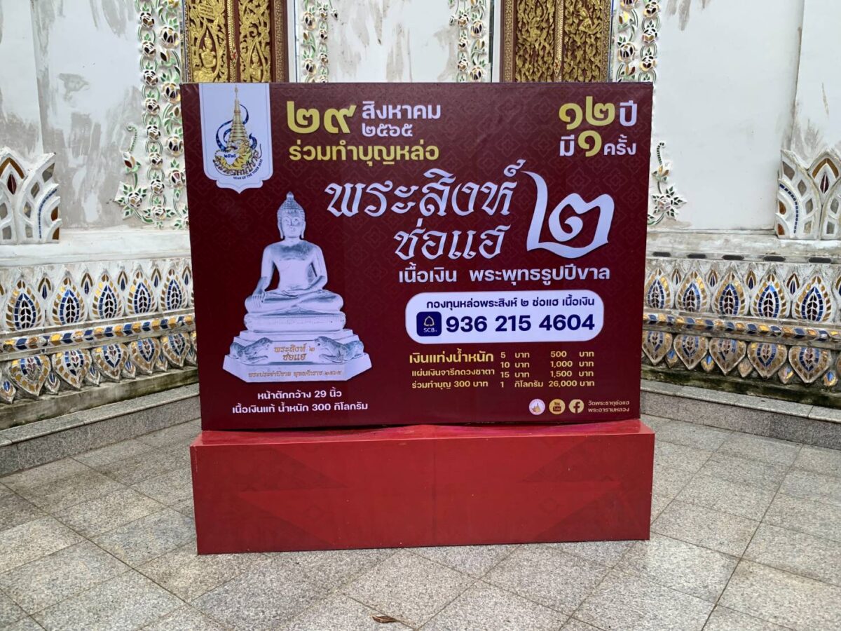 จากนั้น วันจันทร์ ที่ 29 สิงหาคม 2565 ขึ้น 3 ค่ำเดือน 10 ใต้ เดือน 12 เหนือ เริ่มพิธี เวลา 10.09 น. เป็นพิธีบวงสรวงเทพยดาอารักษ์ พระเดชพระคุณพระโกศัยเจติยารักษ์ เจ้าอาวาสวัดพระธาตุช่อแฮ พระอารามหลวง/ รองจ้าคณะ จ.แพร่ ประธานฝ่ายบรรพชิต จุดเครื่องบูชาพระรัตนตรัย ศาสนพิธีกรนำกล่าวคำบูชาพระรัตนตรัย พิธีการต่างๆ และการแสดงฟ้อนถวายบูชา โดยนักเรียนโรงเรียนเมืองแพร่ จากนั้นเป็นพิธีเจริญพระพุทธมนต์ สมโภชเงินที่พุทธศาสนชนร่วมทำบุญ เพื่อหล่อพระสิงห์ 2 ช่อแฮ เนื้อเงิน