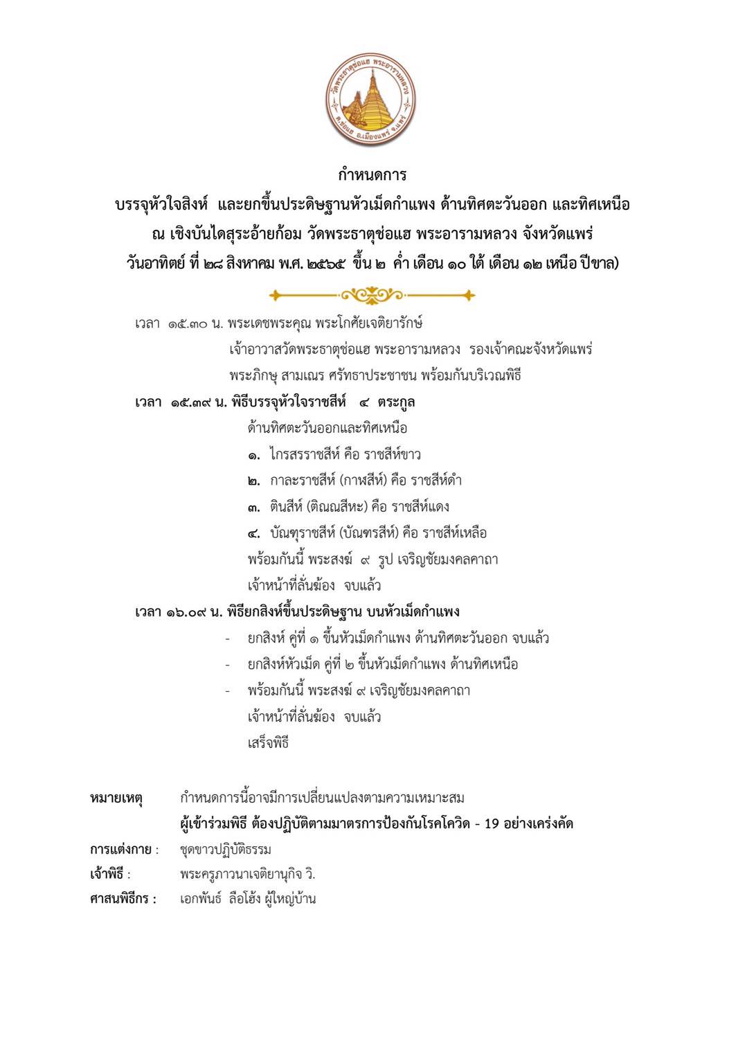 พระโกศัยเจติยารักษ์ รองเจ้าคณะ จ.แพร่/เจ้าอาวาสวัดพระธาตุช่อแฮ พระอารามหลวง เจริญพรกับผู้สื่อข่าวว่า ตามที่วัดพระธาตุช่อแฮ พระอารามหลวง ต.ช่อแฮ อ.เมืองแพร่ กำหนดจัดพิธีใหญ่บรรจุหัวใจสิงห์และพิธีหล่อพระสิงห์ 2 ช่อแฮ เนื้อเงิน พระพุทธรูปประจำปีขาล พ.ศ.2565 ระหว่างวันที่ 28-29 ส.ค.65 นั้น โดยวันที่ 28 ส.ค.65 จะมีพิธีบรรจุหัวใจสิงห์ และยกจนถึงหัวเม็ดกำแพง ด้านทิศตะวันออก และทิศเหนือ ณ เชิงบันไดสุระอ้ายก้อม วัดพระธาตุช่อแฮฯ โดยเวลา 15.39 น. พิธีบรรจุหัวใจราชสีห์ 4 ตระกูล ด้านทิศตะวันออกและทิศเหนือ ซึ่งประกอบไปด้วย ไกรสรราชสีห์ คือ ราชสีห์ขาว กาละราชสีห์ (กาฬสีห์) คือ ราชสีห์ดำ ตินสีห์ (ติณณสีหะ) คือ ราชสีห์แดง บัณฑุราชสีห์ (บัณฑรสีห์) คือ ราชสีห์เหลือ เวลา 16.09 น. เป็นพิธียกสิงห์ขึ้นประดิษฐาน บนหัวเม็ดกำแพง โดยพระสงฆ์ 9 รูปเจริญมงคลชัยคาถา เป็นอันเสร็จพิธี