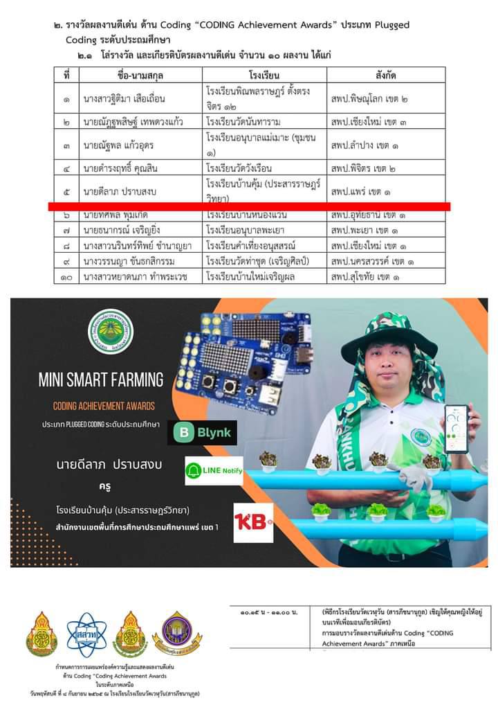 Coding ระดับประถมศึกษาโล่รางวัล และเกียรติบัตรผลงานดีเด่น จำนวน 10 ผลงาน ในจำนวนนี้ มี ข้าราชการครู สังกัด สพป.แพร่เขต 1 ได้รับโล่รางวัลเกียรติบัตรดีเด่น คือ นายดีลาภ ปราบสงบ ครูโรงเรียนบ้านคุ้ม (ประสารราษฎร์วิทยา) สพป.แพร่ เขต 1