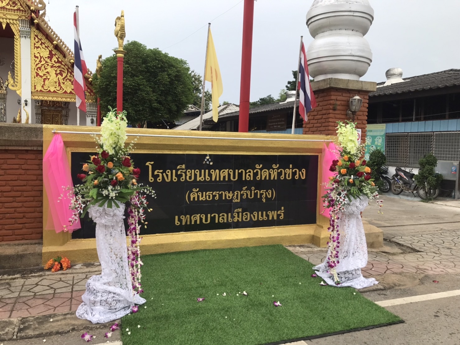 ในการนี้ ป้ายชื่อ “โรงเรียนเทศบาลวัดหัวข่วง คันธราษฎร์บำรุง เทศบาลเมืองแพร่ “ ได้รับการอนุเคราะห์จากท่านพระนพพล กิตติสาโร เจ้าอาวาสวัดหัวข่วง คณะศรัทธาชุมชนหัวข่วง อนุญาติใช้พื้นที่กำแพงวัดหัวข่วง ในการทำป้ายได้รับอนุเคราะห์ในการดำเนินการจัดทำแผ่นป้าย จากนางลัลน์ทริมาล วงศ์บุรี โดยการใช้วัสดุแผ่นหินแกรนิต เลเซอร์ตัวหนังสือลงทอง ติดตั้งจนแล้วเสร็จ