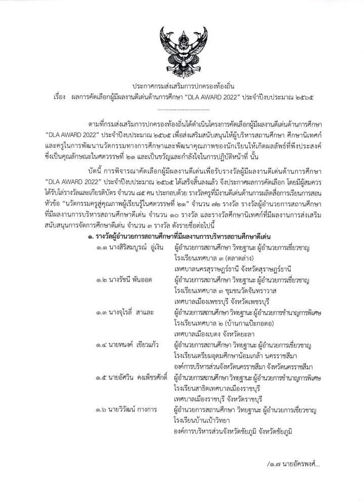 ผู้สื่อข่าวรายงานว่า ได้มีประกาศกรมส่งเสริมการปกครองท้องถิ่น เรื่อง ผลการคัดเลือกผู้มีผลงานดีเด่นด้านการศึกษา “DLA AWARD 2022” ประจำปีงบประมาณ 2565 ความว่า ตามที่กรมส่งเสริมการปกครองท้องถิ่นได้ดำเนินโครงการคัดเลือกผู้มีผลงานดีเด่นด้านการศึกษา “DLA AWARD 2022” ประจำปีงบประมาณ 2565 เพื่อส่งเสริมสนับสนุนให้ผู้บริหารสถานศึกษา ศึกษานิเทศก์และครูในการพัฒนานวัตกรรมทางการศึกษาและพัฒนาคุณภาพของนักเรียน ให้เกิดผลลัพธ์ที่พึงประสงค์ซึ่งเป็นคุณลักษณะในศตวรรษที่ 21 และเป็นขวัญและกำลังใจในการปฏิบัติหน้าที่ นั้น