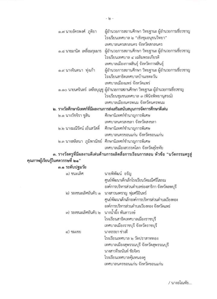 บัดนี้ การพิจารณาคัดเลือกผู้มีผลงานดีเด่นเพื่อรับรางวัลผู้มีผลงานดีเด่น ด้านการศึกษา “DLA AWARD 2022” ประจำปิงบประมาณ 2565 ได้เสร็จสิ้นลงแล้ว จึงประกาศผลการคัดเลือก โดยมีผู้สมควรได้รับโล่รางวัลและเกียรติบัตร จำนวน 85 คน ประกอบด้วย รางวัลครูที่มีงานดีเด่นด้านการผลิตสื่อการเรียนการสอน หัวข้อ “นวัตกรรมครูสู่คุณภาพผู้เรียนรู้ในศตวรรษที่ 21” จำนวน 72 รางวัล รางวัลผู้อำนวยการสถานศึกษาที่มีผลงานการบริหารสถานศึกษาดีเด่น จำนวน 10 รางวัล และรางวัลศึกษานิเทศก์ที่มีผลงานการส่งเสริมสนับสนุนการจัดการศึกษาดีเด่น จำนวน 3 รางวัล ดังรายชื่อต่อไปนี้