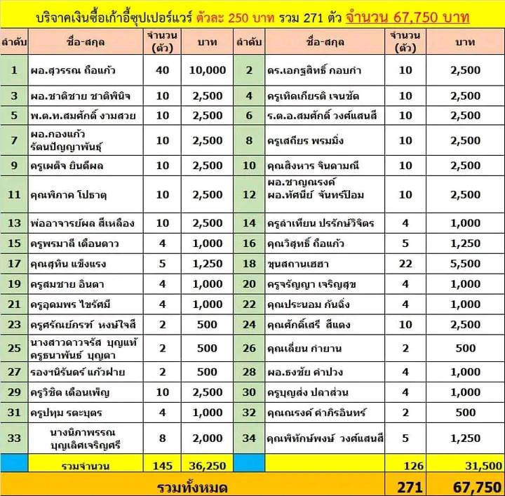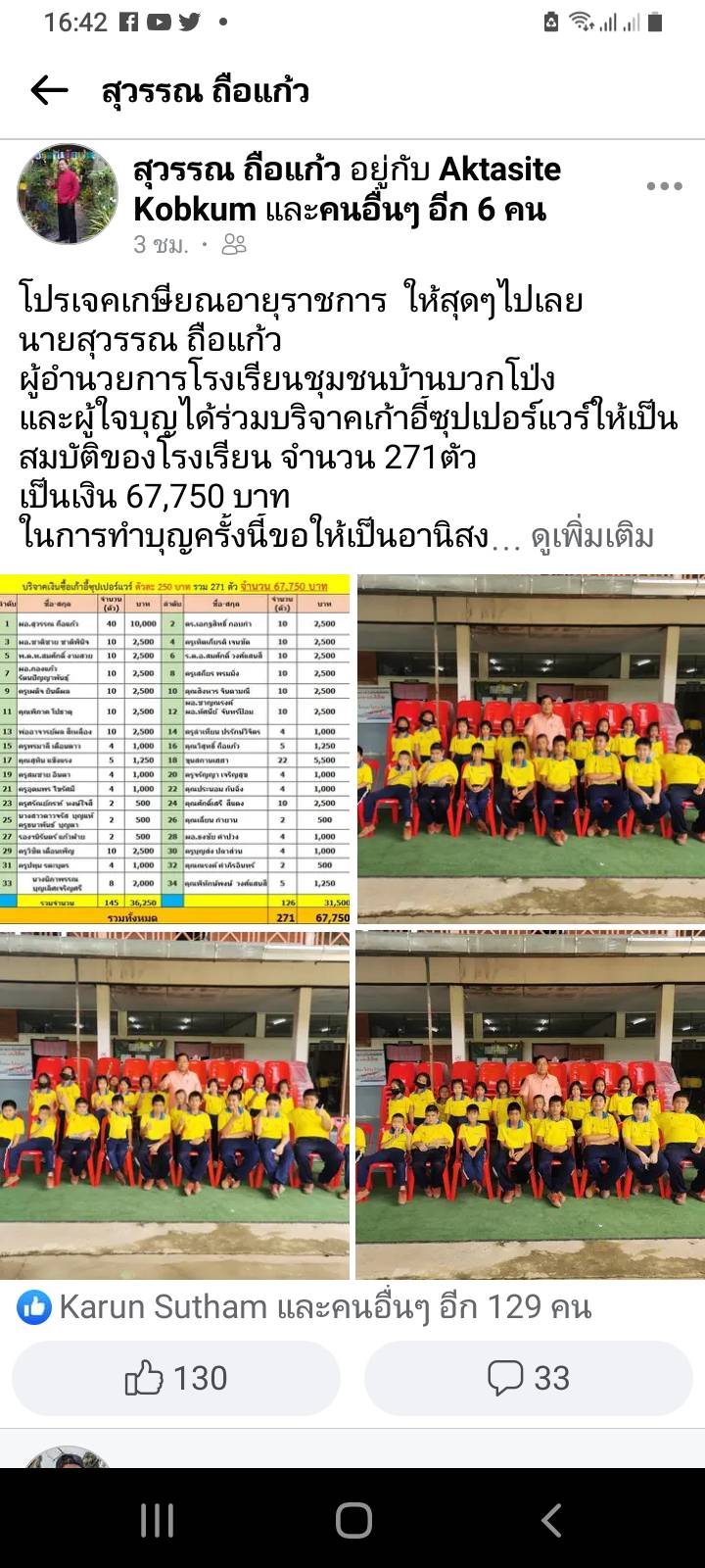 โปรเจคเกษียณอายุราชการ ให้สุดๆ ไปเลย นายสุวรรณ ถือแก้ว ผู้อำนวยการโรงเรียนชุมชนบ้านบวกโป่ง และผู้ใจบุญได้ร่วมบริจาคเก้าอี้ซุปเปอร์แวร์ให้เป็นสมบัติของโรงเรียน จำนวน 271 ตัว เป็นเงิน 67,750 บาท ในการทำบุญครั้งนี้ขอให้เป็นอานิสงฆ์ผลบุญให้ทุกท่านได้สุขภาพสมบูรณ์ แข็งแรง คิดสิ่งหนึ่งประการใดก็ขอให้สมความมุ่งมาดปรารถนาทุกประการคร๊าบ