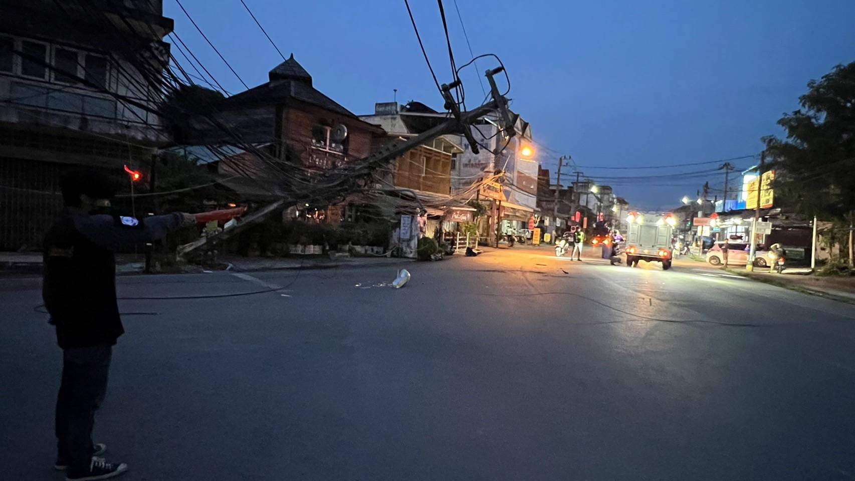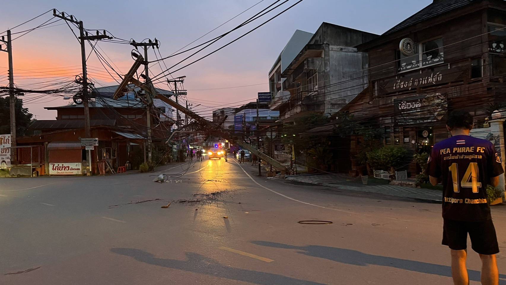 เมื่อเวลา 18.10 น. วันที่ 28 ก.ย.65 ร.ต.อ.เสกสรรค์ ปัญญายืน รองสารวัตรสอบสวน พนักงานสอบสวนประจำวัน สภ.เมืองแพร่ รับแจ้งเหตุว่ามีรถเกี่ยวสายไฟ บริเวณ 3 แยกเหมืองหิต ต.ในเวียง อ.เมืองแพร่ จ.แพร่ ทำให้เสาไฟฟ้าต้นใหญ่ล้มขวางถนน รถไม่สามารถผ่านทางได้ หวั่นเกิดอันตราย หลังรับแจ้งจึงประสานเจ้าหน้าที่การไฟฟ้า ภูมิภาค จ.แพร่ เจ้าหน้าที่กู้ภัยแพร่ เจ้าหน้าที่ตำรวจสจราจร สภ.เมืองแพร่ อำนวยความสะดวกด้านการจราจรและรุดไปตรวจสอบที่เกิดเหตุ