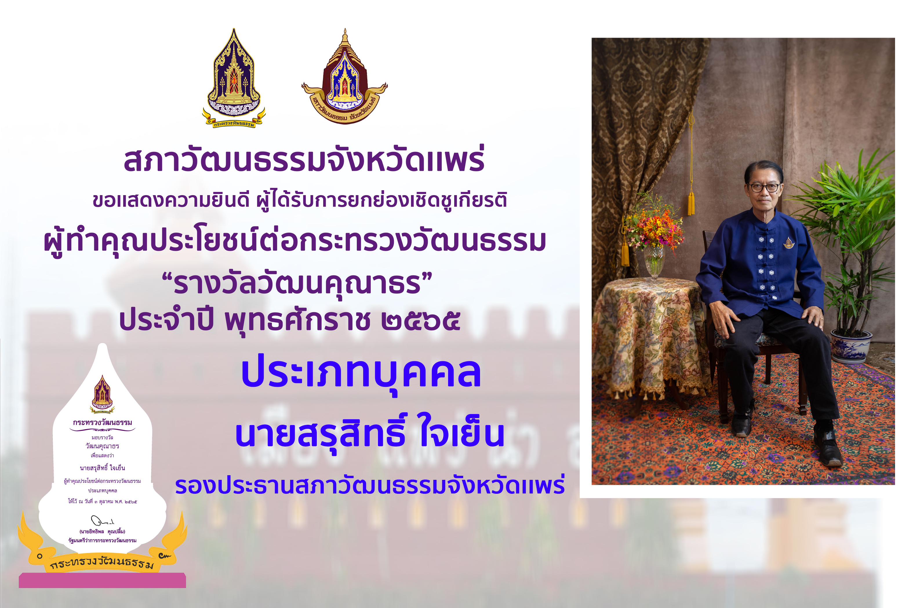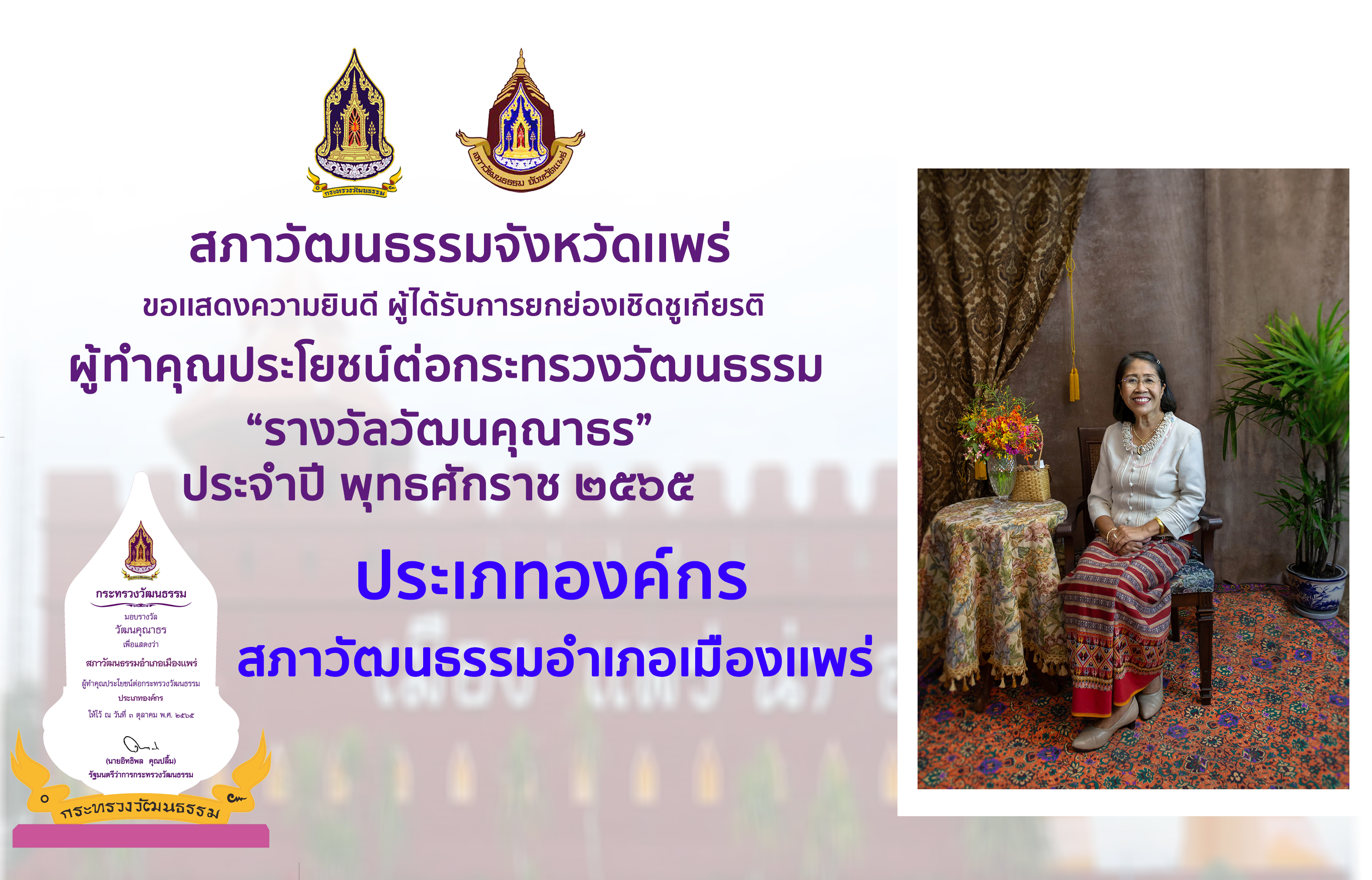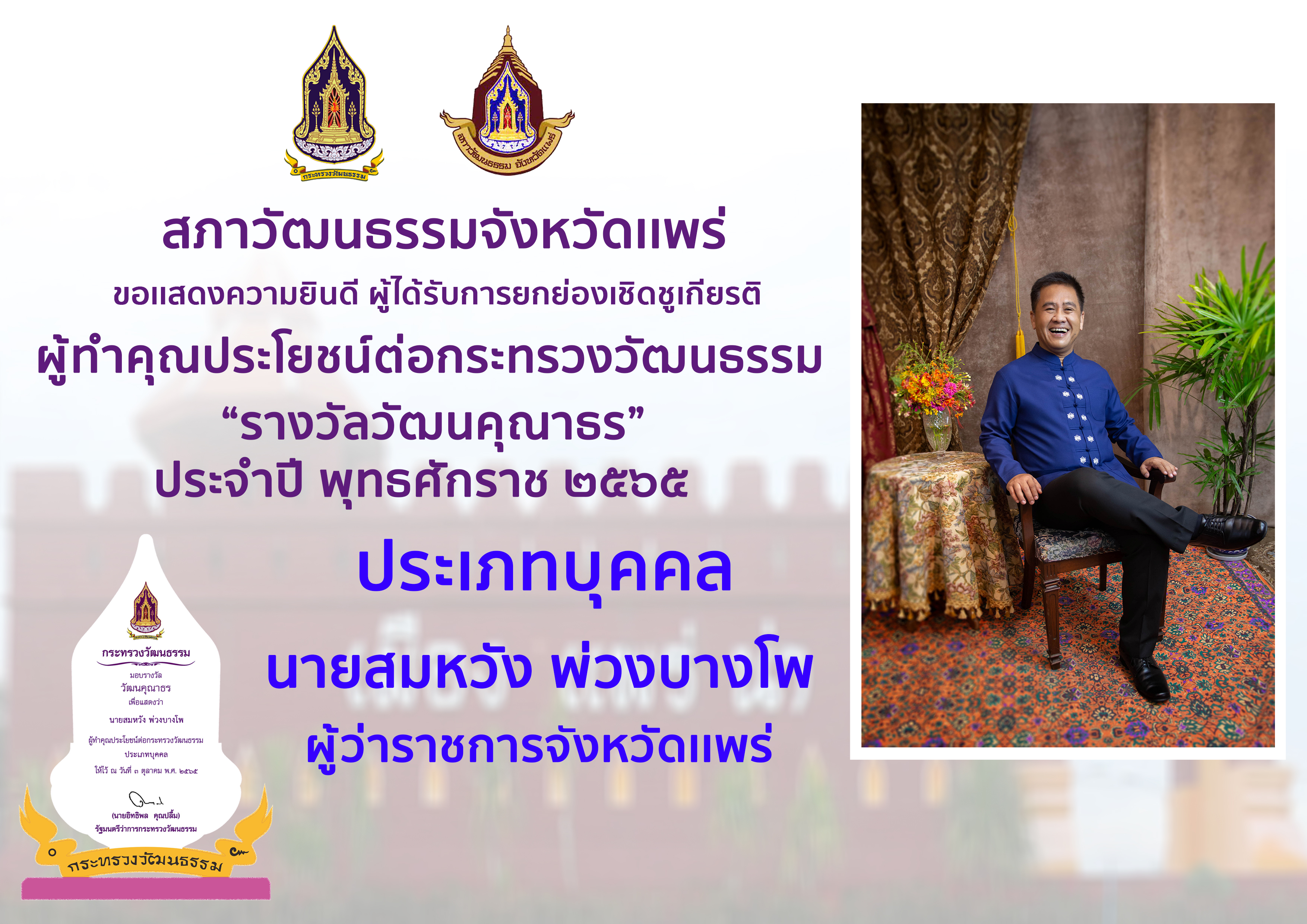 ในการนี้นายเอกชัย วงศ์วรกุล ประธานสภาวัฒนธรรมจังหวัดแพร่ สิบเอกหญิงกรวรรณ สุ่มมาตย์ วัฒนธรรมจังหวัดแพร่ ร่วมแสดงความยินดีกับ ผู้ที่ได้รางวัล “วัฒนคุณาธร”ดังกล่าวด้วย