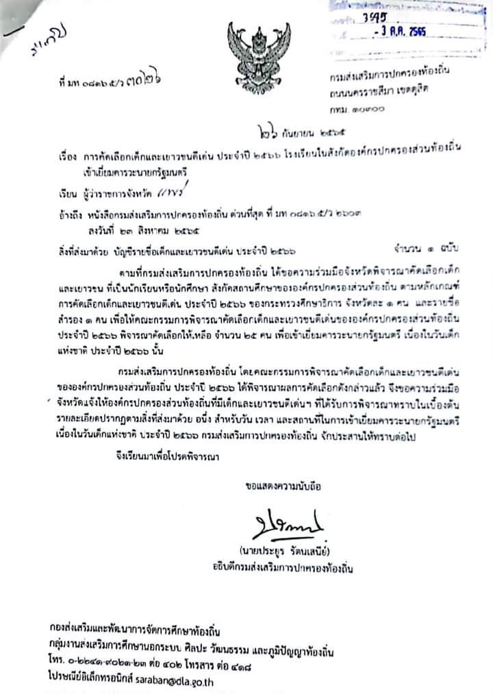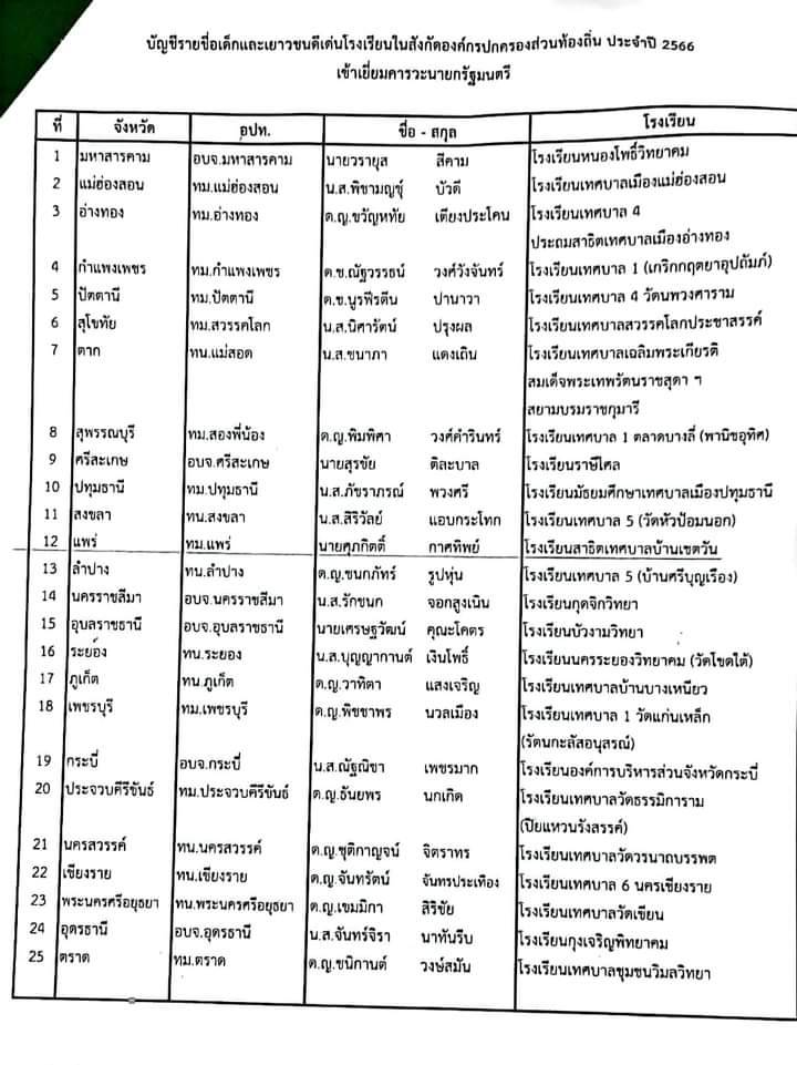 ให้ได้รับรางวัล เด็กและเยาวชนดีเด่น ขององค์กรปกครองส่วนท้องถิ่น ประจำปี พ.ศ. 2566 และเข้าเยี่ยมคารวะนายกรัฐมนตรี เนื่องในวันเด็กแห่งชาติ ประจำปี พ.ศ.2566