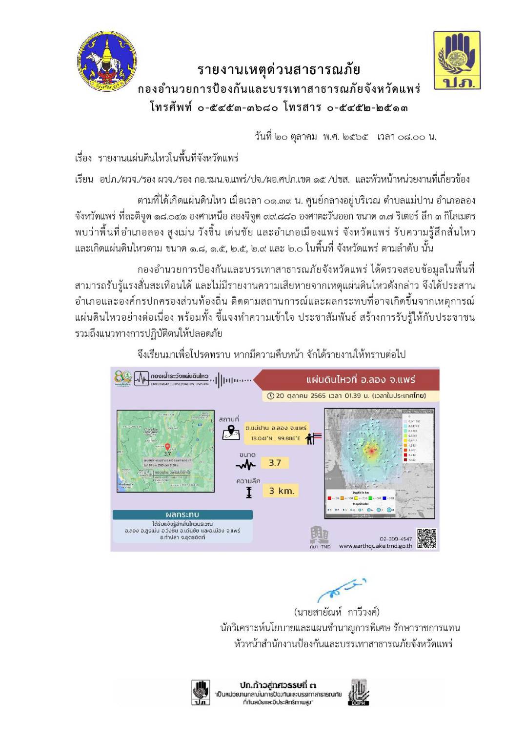 ผู้สื่อข่าวรายงานว่า สนง.ปภ.จ.แพร่ รายงานว่าตามที่ได้เกิดแผ่นดินไหว เมื่อเวลา 01.39 น. ศูนย์กลางอยู่บริเวณ ต.แม่ปาน อ.ลอง ที่ละติจูด 18.041 องศาเหนือ ลองจิจูด 99.886 องศาตะวันออก ขนาด 3.7ริกเตอร์ ลึก 3 กิโลเมตร