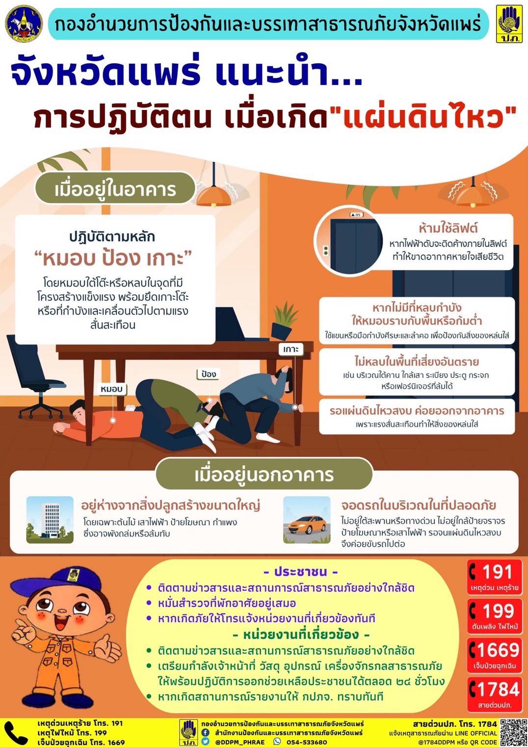 กองอำนวยการป้องกันและบรรเทาสาธารณภัย จ.แพร่ ได้ตรวจสอบข้อมูลในพื้นที่สามารถรับรู้แรงสั่นสะเทือนได้ และไม่มีรายงานความเสียหายจากเหตุแผ่นดินไหวดังกล่าว จึงได้ประสาน อำเภอและองค์กรปกครองส่วนท้องถิ่น ติดตามสถานการณ์และผลกระทบที่อาจเกิดขึ้น จากเหตุการณ์แผ่นดินไหวอย่างต่อเนื่อง พร้อมทั้ง ชี้แจงทำความเข้าใจ ประชาสัมพันธ์ สร้างการรับรู้ให้กับประชาชน