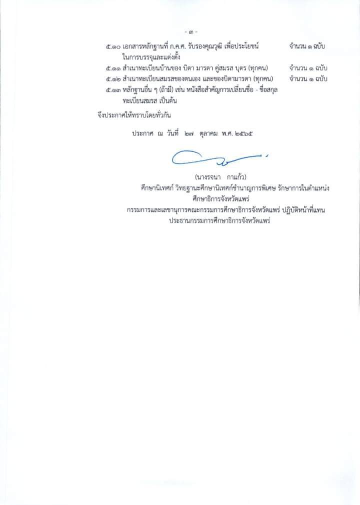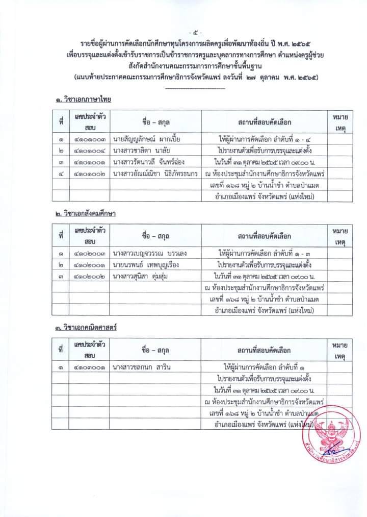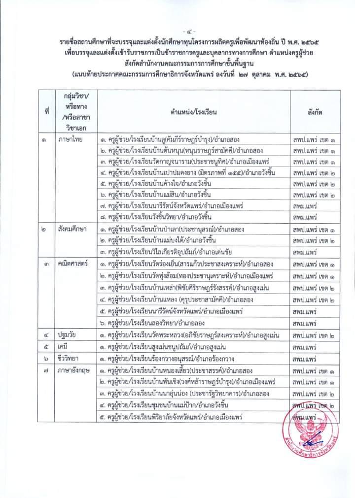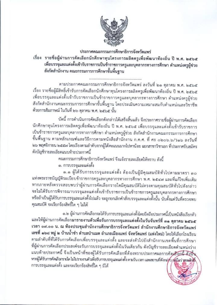 บัดนี้กศจ.แพร่ได้ประกาศ กศจ.แพร่ เรื่อง รายชื่อผู้ผ่านการคัดเลือกนักศึกษาทุนโครงการผลิตครูเพื่อพัฒนาท้องถิ่นปี พ.ศ. 2565 เพื่อบรรจุและแต่งตั้งเข้ารับราชการเป็นข้าราชการครูและบุคลากรทางการศึกษา ตำแหน่งครูผู้ช่วย สังกัดสำนักงาน คณะกรรมการการศึกษาขั้นพื้นฐานตามรายละเอียด