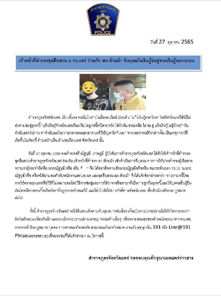 ตำรวจชุดสืบสวน ภ.จ.แพร่ ร่วมกับ สภ.ห้วยม้า จับกุมแก๊งเงินกู้ข่มขู่ทวงเงินกู้นอกระบบ