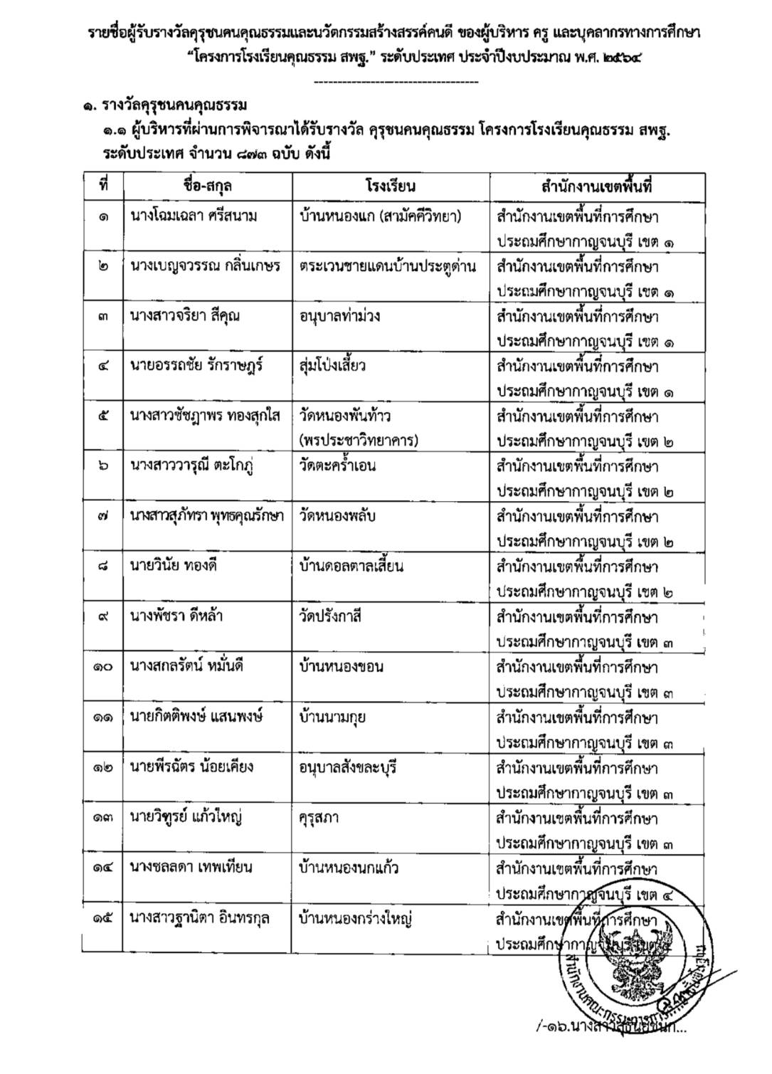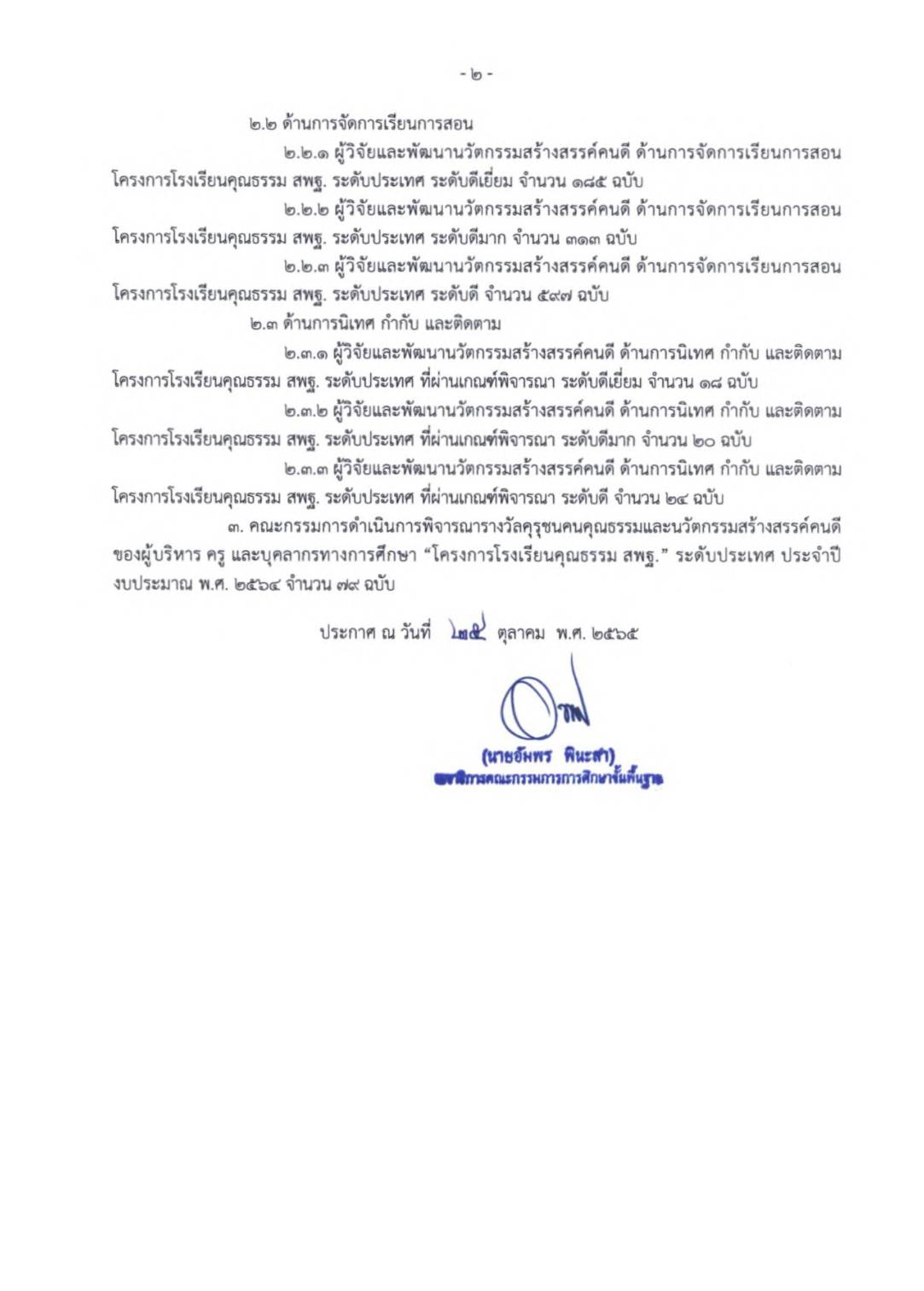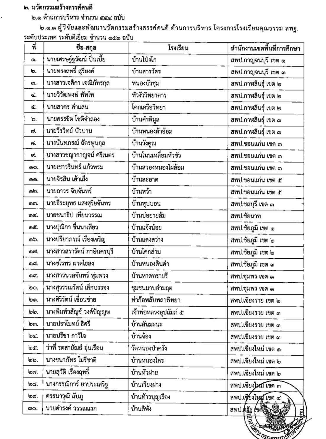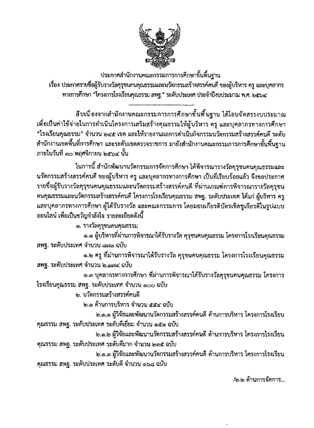 ดร.เกียรติศักดิ์ ชัยยาณะ ผอ.รร.บ้านไร่หลวง ต.นาพูน อ.วังชิ้น จ.แพร่ สังกัด สพป.แพร่ เขต 2 เผยว่า ผู้บริหารและคณะครูโรงเรียนบ้านไร่หลวง สพป.แพร่ เขต 2 ได้รับรางวัลคุรุชนคนคุณธรรมและนวัตกรรมสร้างสรรค์คนดี จำนวน 5 รายการ “โครงการโรงเรียนคุณธรรม สพฐ.” ระดับประเทศ ประจำปีงบประมาณ พ.ศ. 2564 ดังนี้