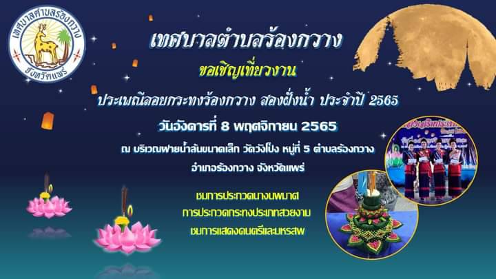 นายพิพัฒน์ ซื่อทรงธรรม นายกเทศมนตรีตำบลร้องกวาง อ.ร้องกวาง จ.แพร่ เผยว่าเทศบาลตำบลร้องกวาง และชาวอำเภอร้องกวางขอเชิญเที่ยวงานสืบสานประเพณีลอยกระทงร้องกวาง สองฝั่งน้ำ ประจำปี 2565