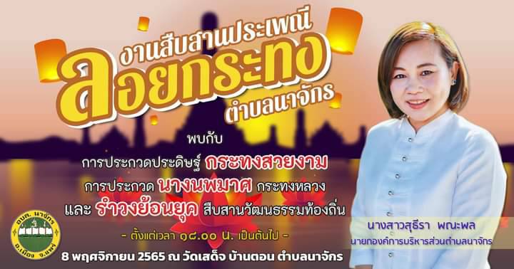 นายกอ้อ น.ส.สุธีรา พณะพล นายก อบต.นาจักรจึงขอเชิญชวนชาวนาจักร และพี่น้องพื้นที่ใกล้เคียง มาร่วมสนุกในงานลอยกระทงของตำบลนาจักร ภายในงานจะมีการประกวดกระทงจากวัสดุธรรมชาติ การประกวดนางนพมาศกระทงหลวงนาจักร และดนตรีรำวงย้อนยุคแบบมินิ โดยในปีนี้นายกอ้อจะจัดงานน่ารักๆ แบบ “ม่วนจ้อม” ให้พี่น้องชาวนาจักรได้มาสัมผัสบรรยากาศแบบเป็นกันเองมาสนุกสนานด้วยกันนะ