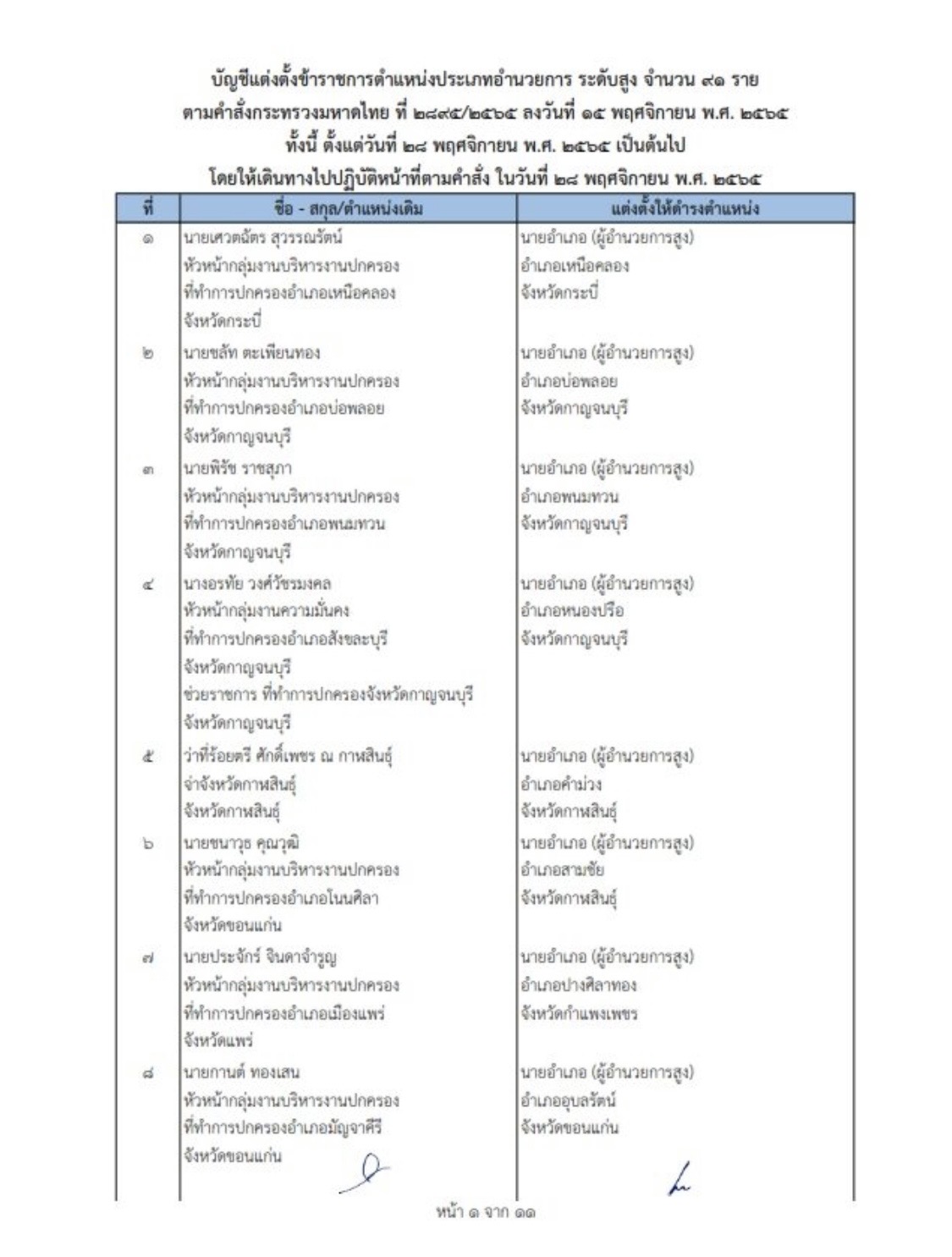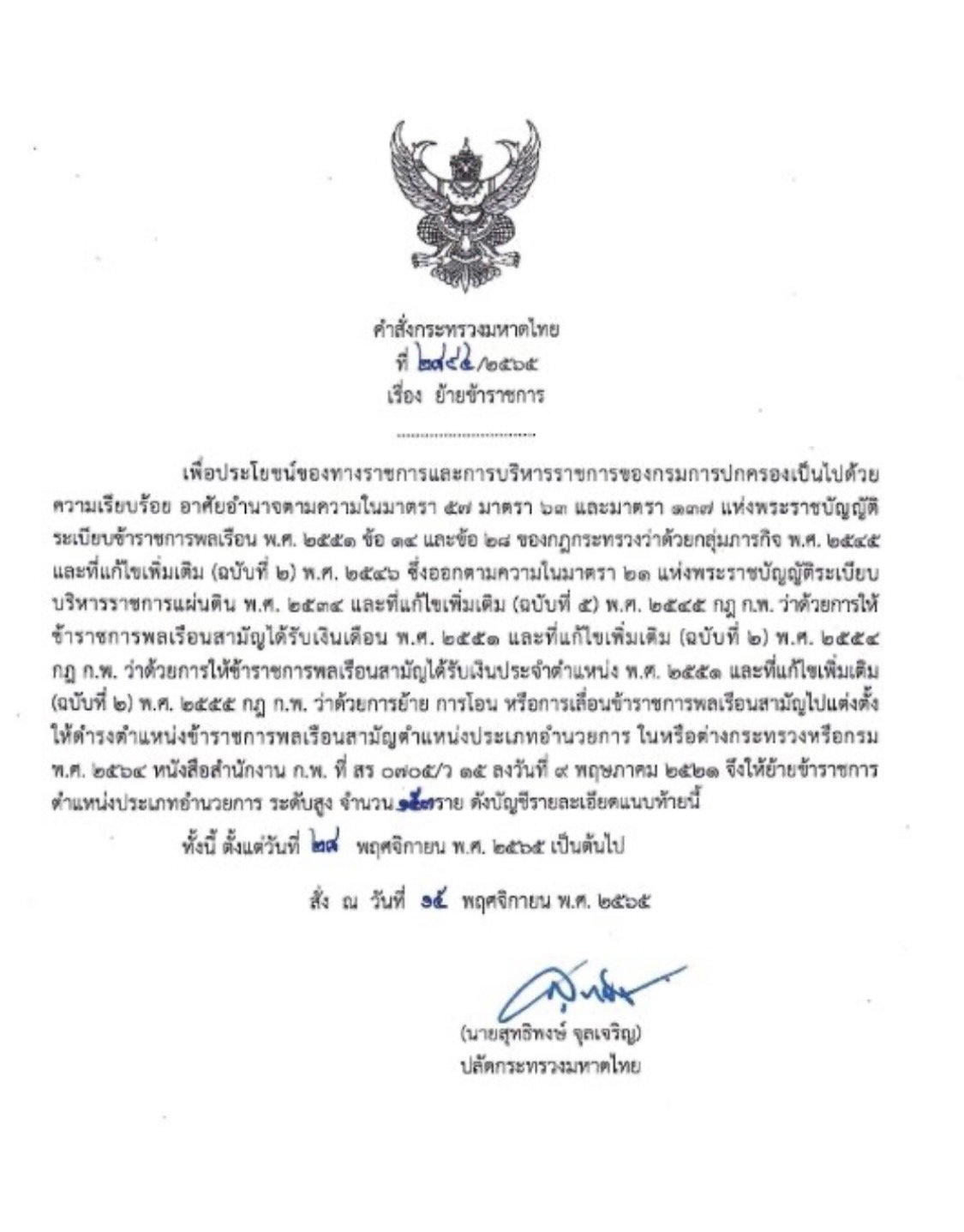 ทั้งนี้ ตั้งแต่วันที่ 28 พฤศจิกายน พ.ศ. 2565 เป็นต้นไป สั่ง ณ วันที่ 15 พฤศจิกายน พ.ศ.2565 นายสุทธิพงษ์ จุลเจริญ ปลัดกระทรวงมหาดไทย