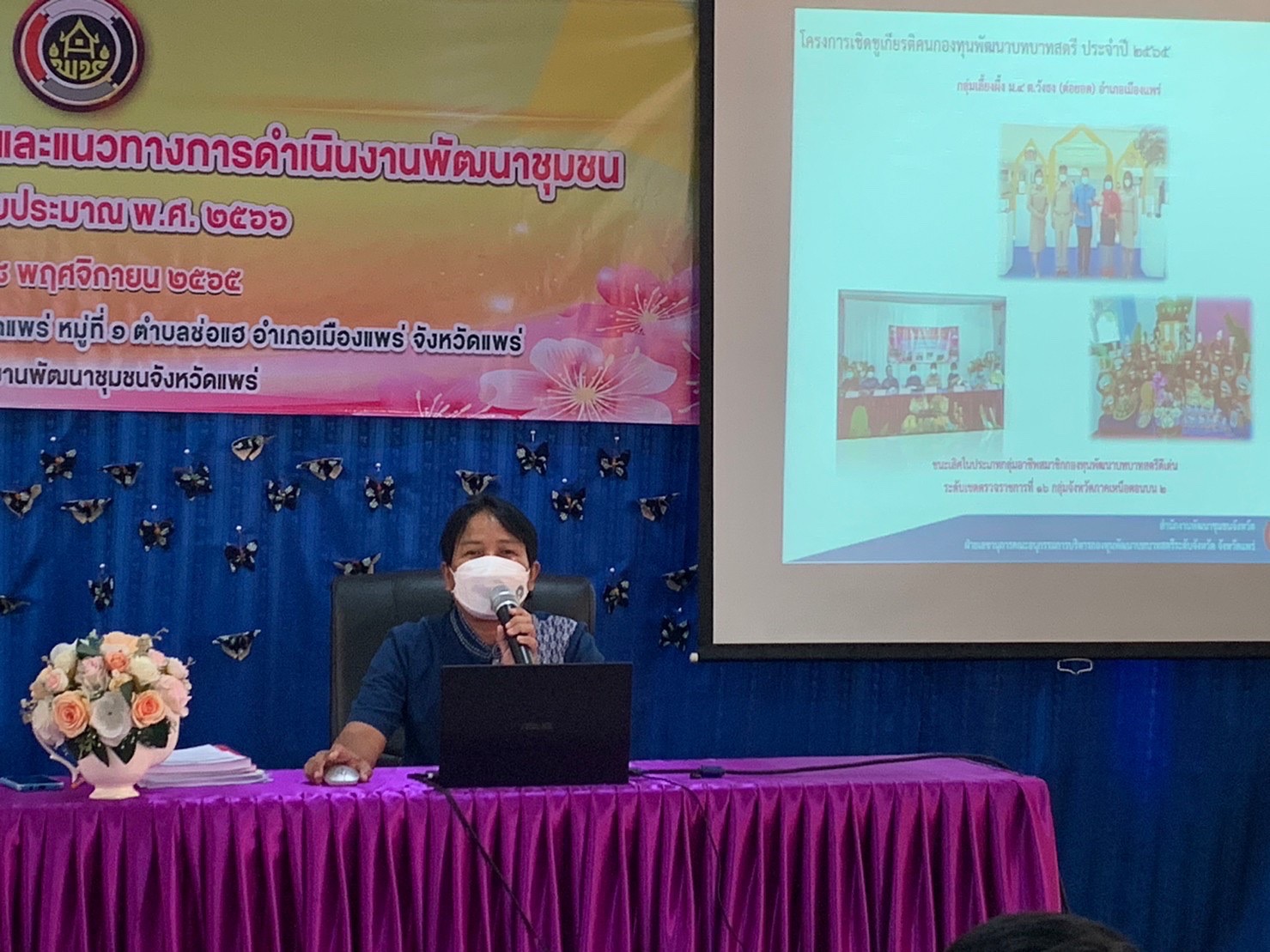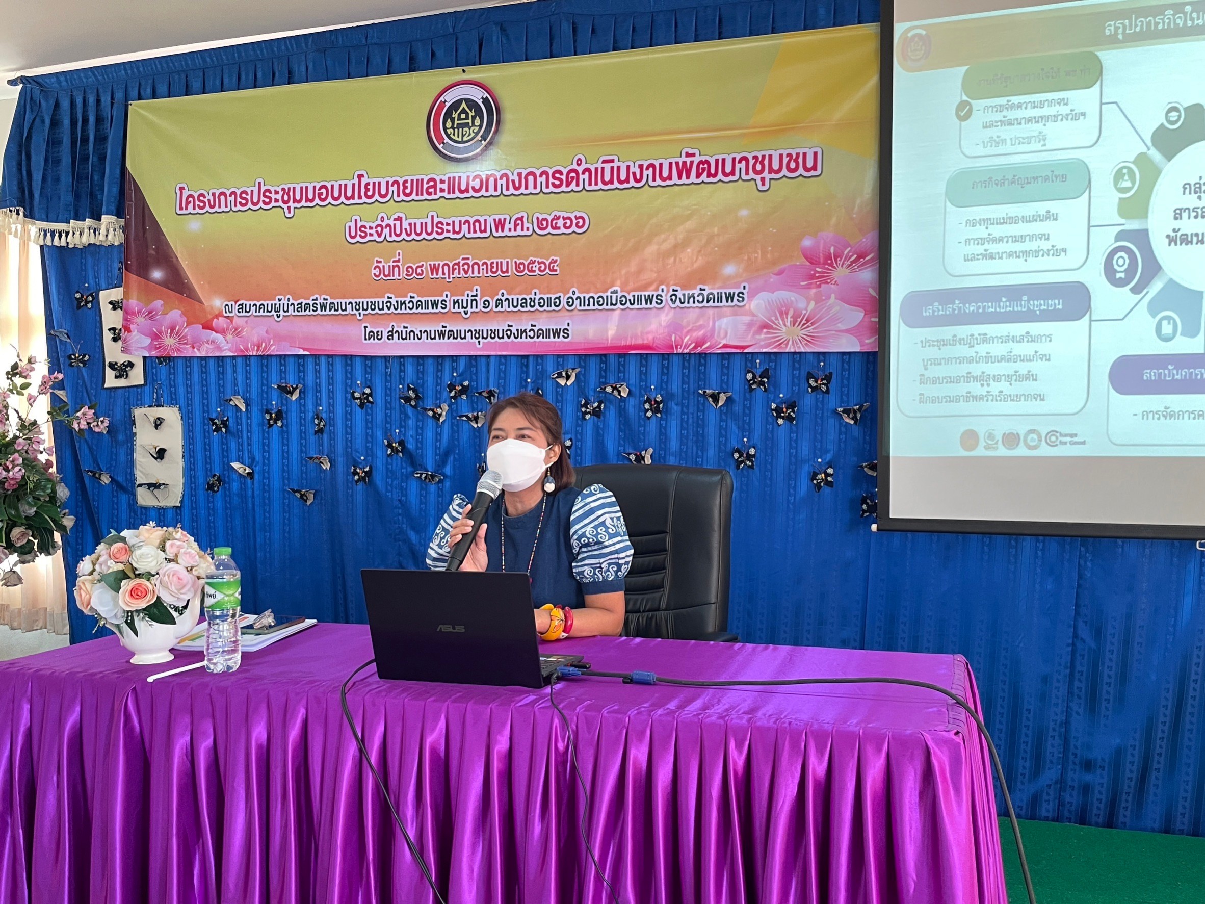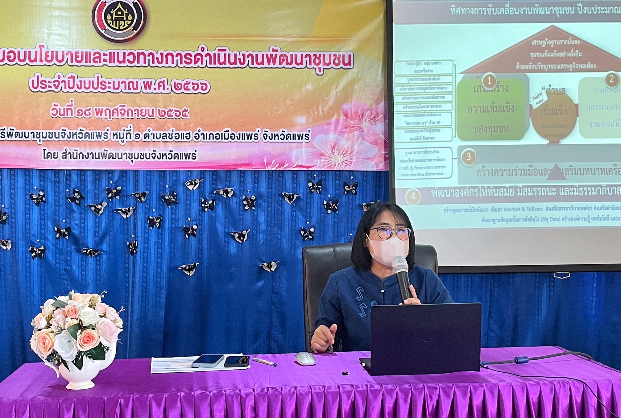 เมื่อวันที่ 18 พฤศจิกายน 2565 ณ สมาคมผู้นำสตรีพัฒนาชุมชนจังหวัดแพร่ หมู่ที่ 1 ตำบลช่อแฮ อำเภอเมืองแพร่ จังหวัดแพร่ นายวีรกานต์ บุญตัน พัฒนาการจังหวัดแพร่ เป็นประธานเปิดโครงการประชุมมอบนโยบายและแนวทางการดำเนินงานพัฒนาชุมชน ประจำปีงบประมาณ พ.ศ.2566