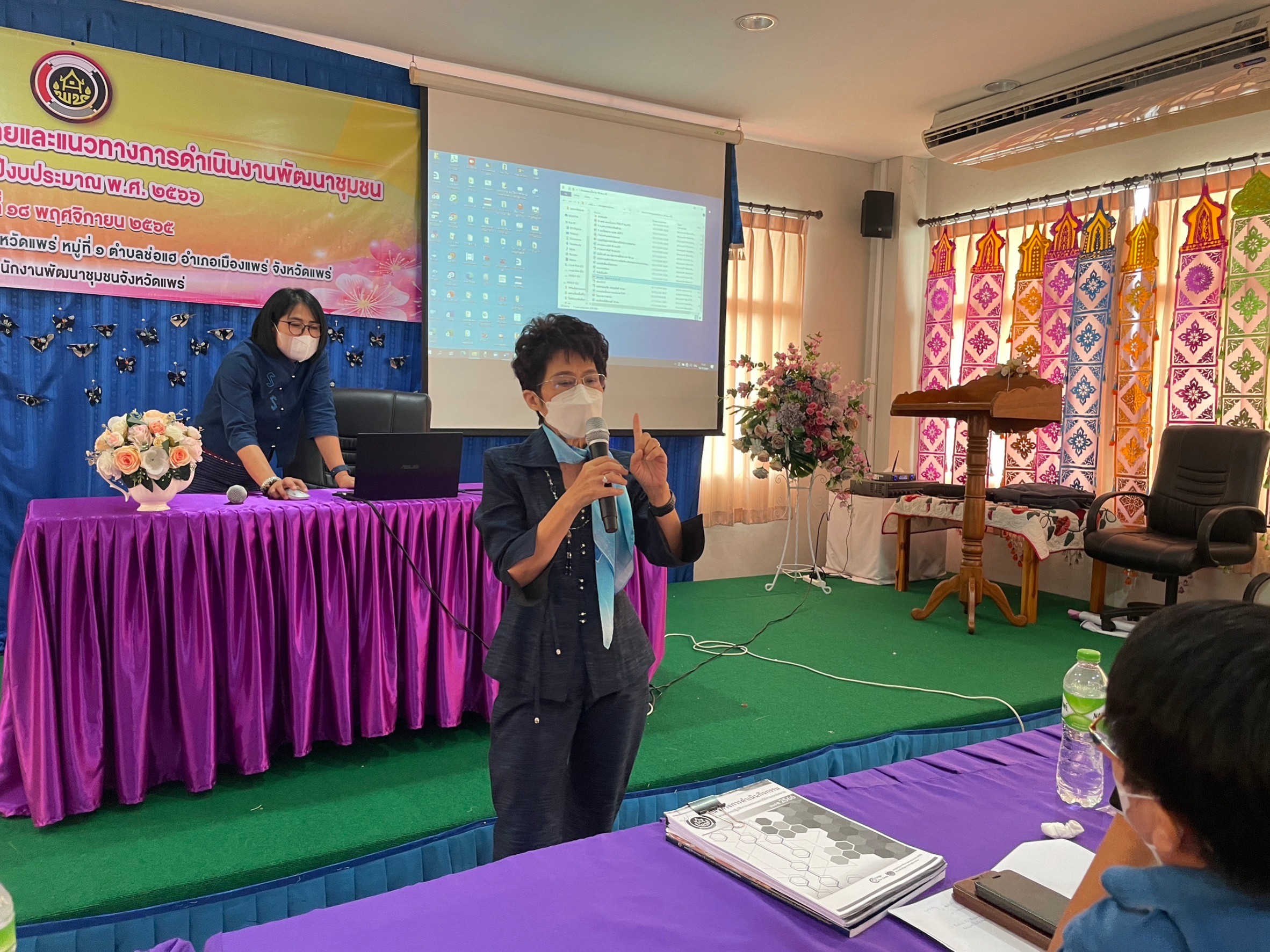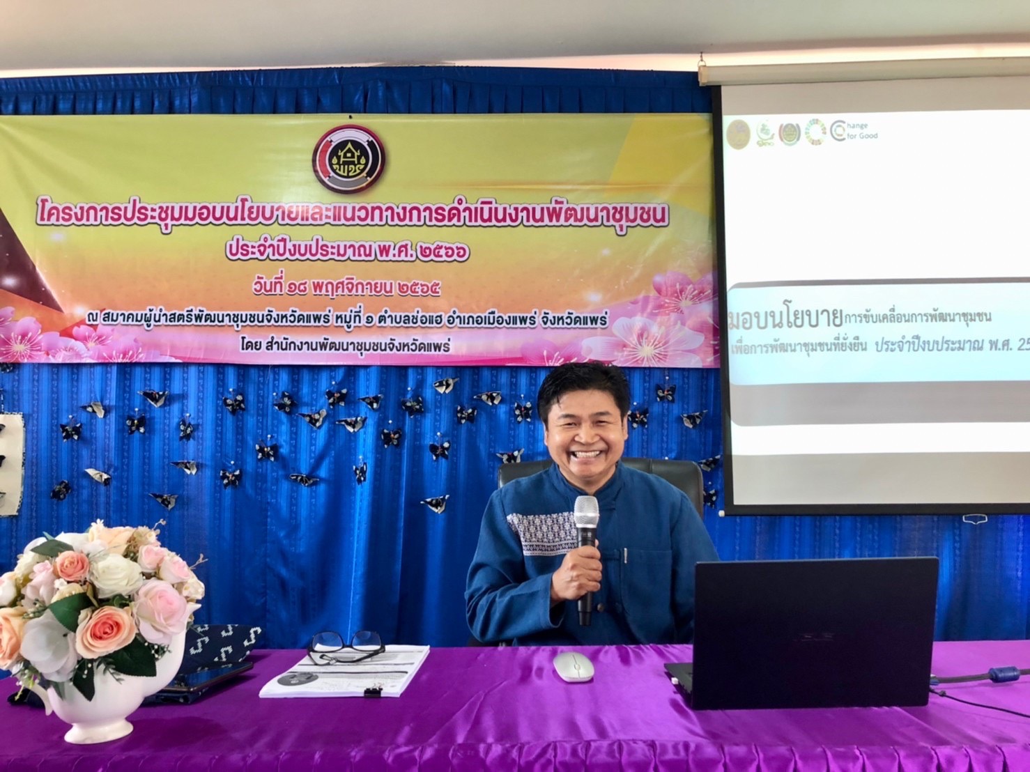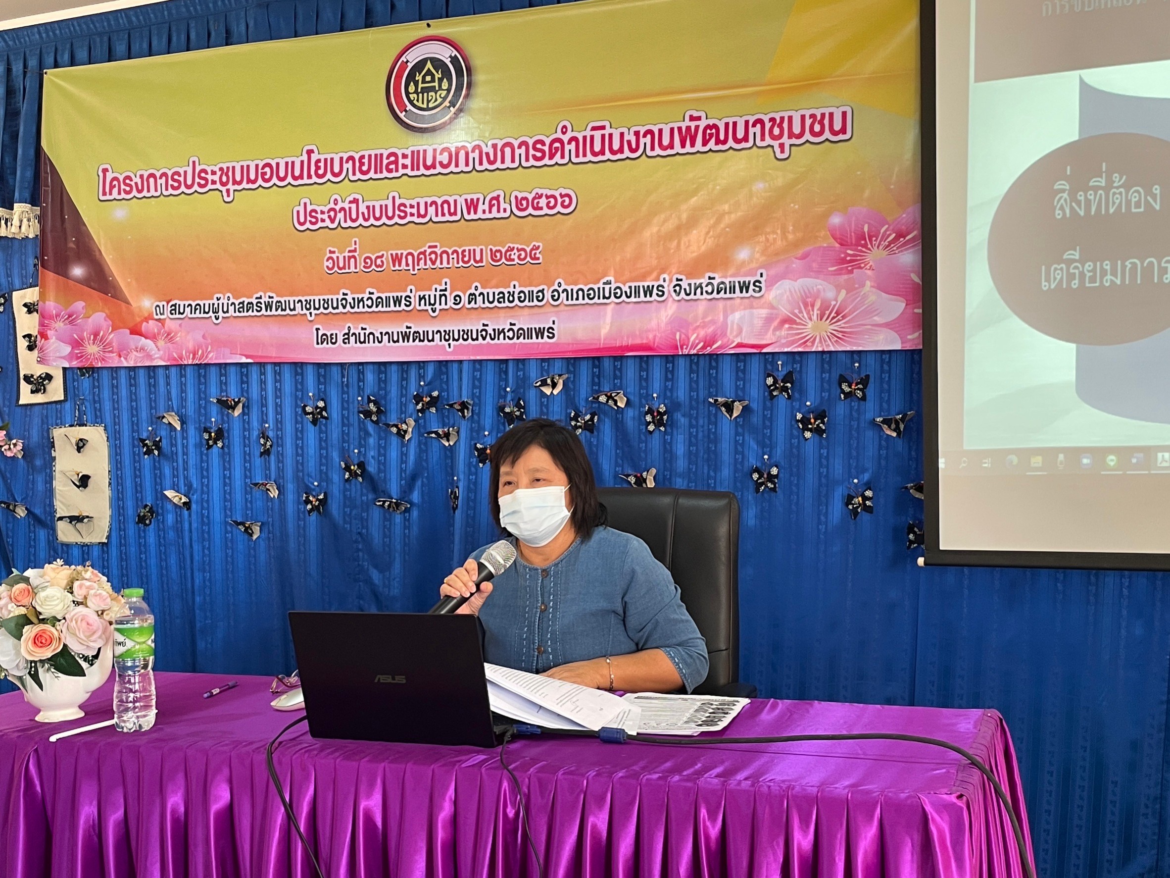 เมื่อวันที่ 18 พฤศจิกายน 2565 ณ สมาคมผู้นำสตรีพัฒนาชุมชนจังหวัดแพร่ หมู่ที่ 1 ตำบลช่อแฮ อำเภอเมืองแพร่ จังหวัดแพร่ นายวีรกานต์ บุญตัน พัฒนาการจังหวัดแพร่ เป็นประธานเปิดโครงการประชุมมอบนโยบายและแนวทางการดำเนินงานพัฒนาชุมชน ประจำปีงบประมาณ พ.ศ.2566