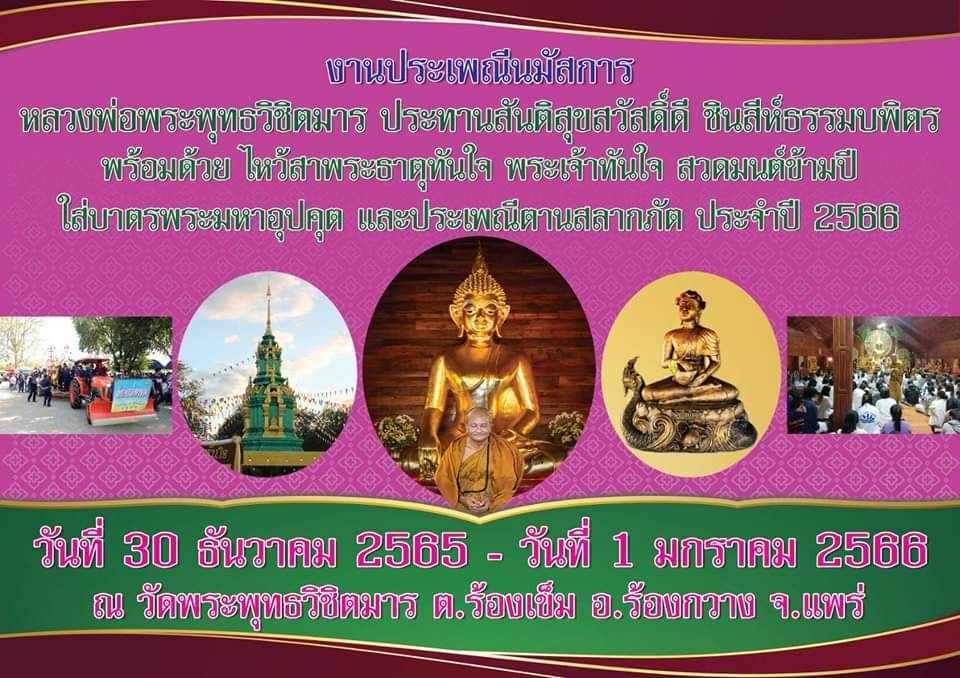ผู้สื่อข่าวได้รับแจ้งจากคณะกรรมการวัดพระพุทธวิชิตมาร ว่าตามที่ วัดพระพุทธวิชิตมาร บ้านใหม่จัดสรร หมู่ 5 ต.ร้องเข็ม อ.ร้องกวาง จ.แพร่ ที่มี พระครูบาพัตร วิสุทธสีโล เป็นรักษาการเจ้าอาวาสวัด ทางคณะกรรมการวัดและศิษยานุศิษย์กำหนดจัดงานประเพณีนมัสการ หลวงพ่อพระพุทธวิชิตมาร ประทานสันติสุขสวัสดิ์ดี ชินสีห์ธรรมบพิตร พร้อมไหว้สาพระธาตุทันใจ พระเจ้าทันใจ สวดมนต์ข้ามปี ใส่บาตรพระมหาอุปคุต และประเพณีตานสลากภัต ประจำปี 2566 ขึ้น ระหว่าง วันที่ 30 ธันวาคม 2565-วันที่ 1 มกราคม 2566 นั้น