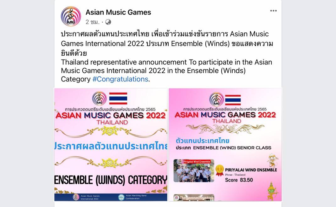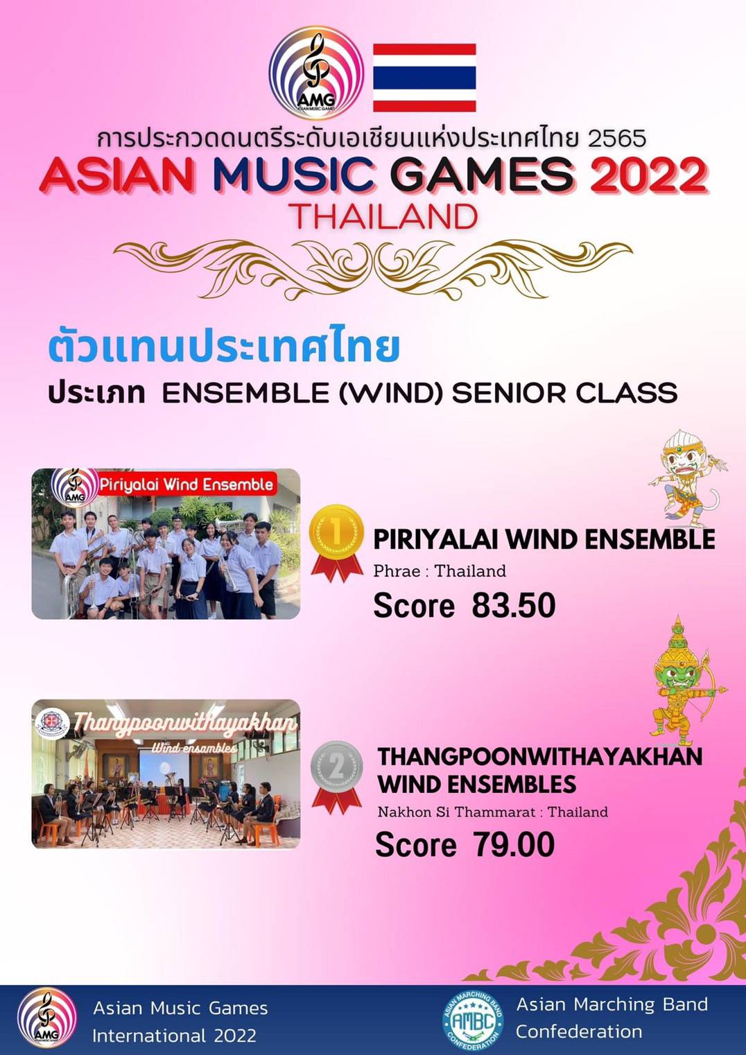 บัดนี้ได้ประกาศคัดเลือกแล้วโดยผลการคัดเลือกตัวแทนประเทศไทย เพื่อร่วมแข่งขันรายการ Asian Music Games International 2022 ประเภท Ensemble (Wind) Senior class