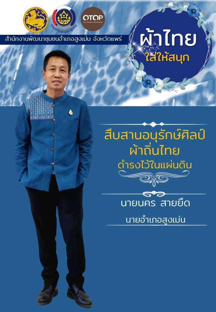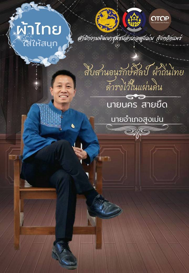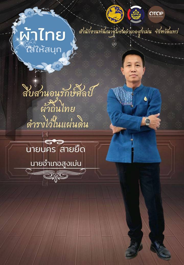 สำนักงานพัฒนาชุมชนอำเภอสูงเม่น เชิญชวนให้ข้าราชการทุกหน่วยงาน องค์กรภาครัฐ ภาคเอกชน และประชาชนในอำเภอสูงเม่น สวมใส่ผ้าไทย/ผ้าพื้นเมือง “ผ้าไทย ใส่ให้สนุก” ความสุขที่ได้เลือกใช้ศิลปะหัตถกรรมไทย เพื่อให้รายได้กลับสู่ชุมชน ส่งเสริม กระตุ้น ผ้าไทยให้เป็นที่นิยมสู่สากล สามารถใส่ได้ทุกเพศ ทุกวัย ตามพระดำริสมเด็จพระเจ้าลูกเธอ เจ้าฟ้าสิริวัณณวรี นารีรัตนราชกัญญา เพื่อสืบสานอนุรักษ์ศิลป์ผ้าถิ่นไทย ดำรงไว้ในแผ่นดิน