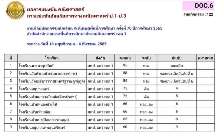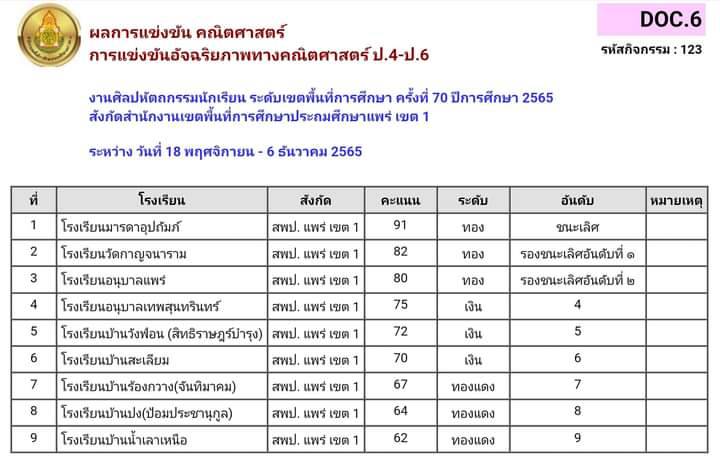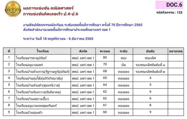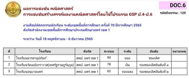 คณิตศาสตร์ 3.การแข่งขันอัจฉริยภาพทางคณิตศาสตร์ ป.1-ป.3 4.การแข่งขันคิดเลขเร็ว ป.4- ป.6./5.การแข่งขันอ้จฉริยภาพทางคณิตศาสตร์ ป.4-ป.6 /6.การแข่งขันสร้างสรรค์ผลงานคณิตศาสตร์โดยใช้โปรแกรมGSPป.1-ป.6 /7.การแข่งขันคิดเลขเร็ว ป.1-ป.3