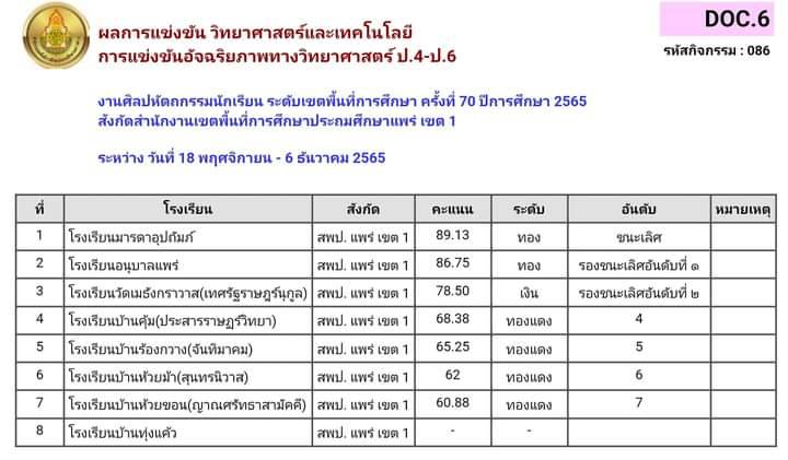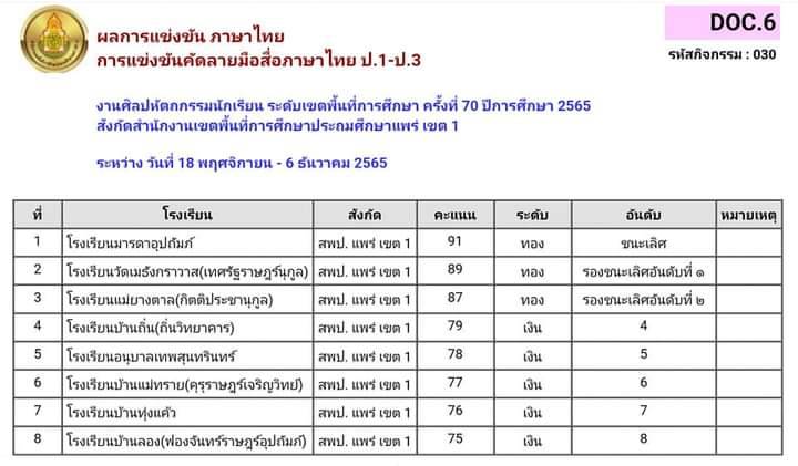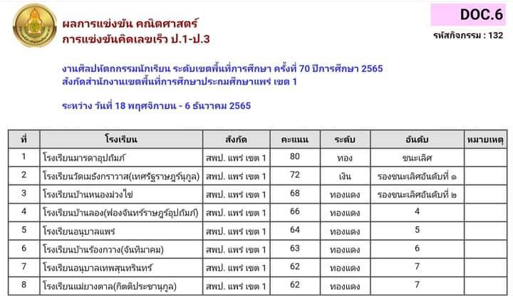 น.ส.สิริกรานต์ เปี่ยมวุฒิ ผอ.รร.มารดาอุปถัมภ์ อ.เมือง จ.แพร่ เผยกับผู้สื่อข่าวว่า ตามที่รร.มารดาอุปถัมภ์ส่งนักเรียนเข้าร่วมแข่งขันเพื่อคัดเลือกเป็นตัวของ สพป.แพร่เขต 1 งานศิลปหัตถกรรมนักเรียนครั้งที่ 70 เพื่อเป็นตัวแทนไปแข่งขันในระดับภาคที่จ.น่าน ปี 2566 นั้นโดยนักเรียนรร.มารดาอุปถัมภ์ได้ชนะเลิศ 12 รายการและเป็นตัวแทนดังนี้