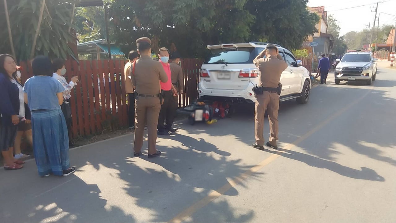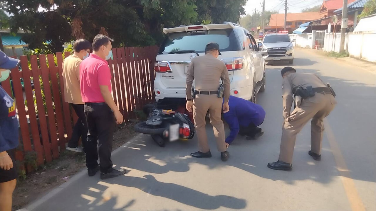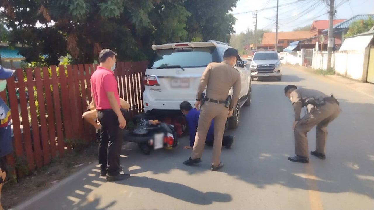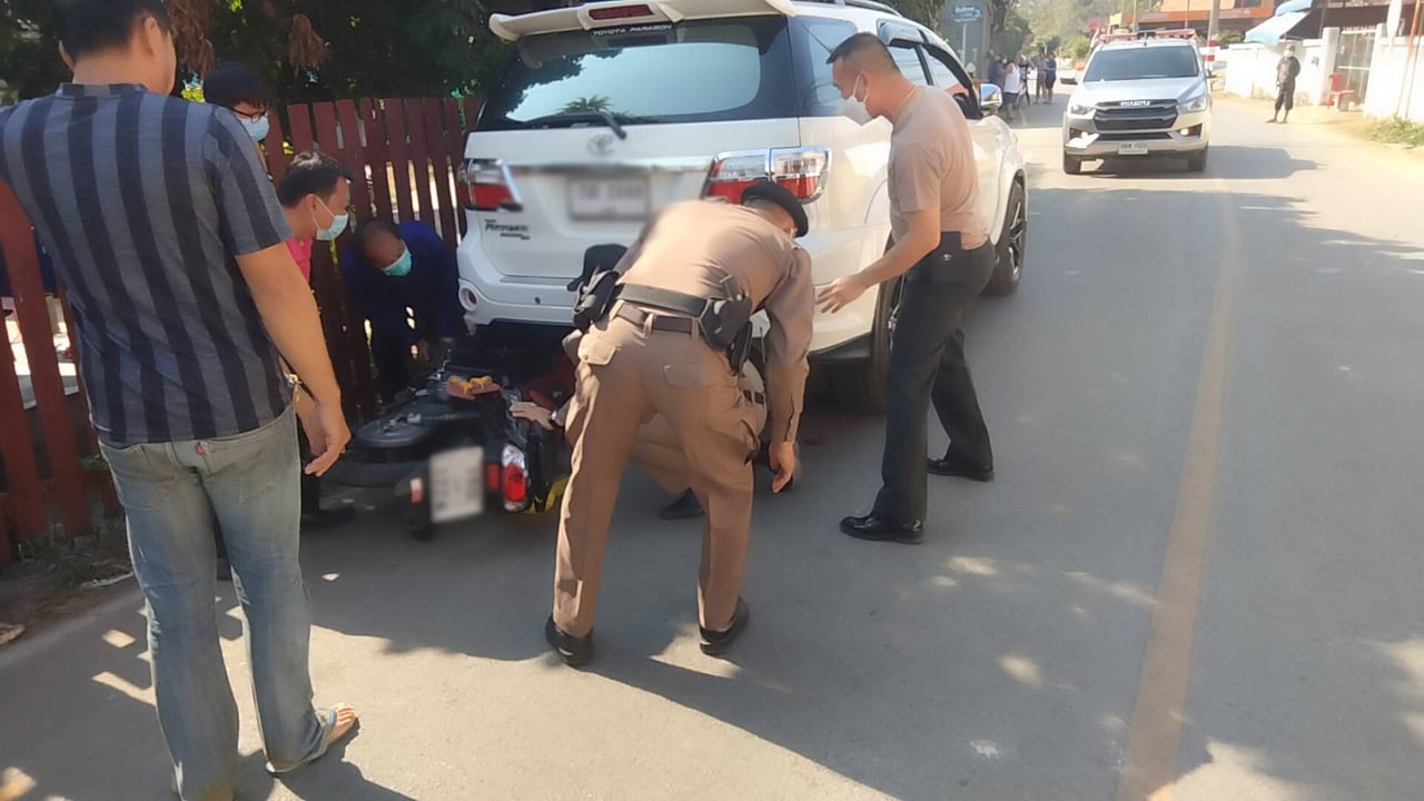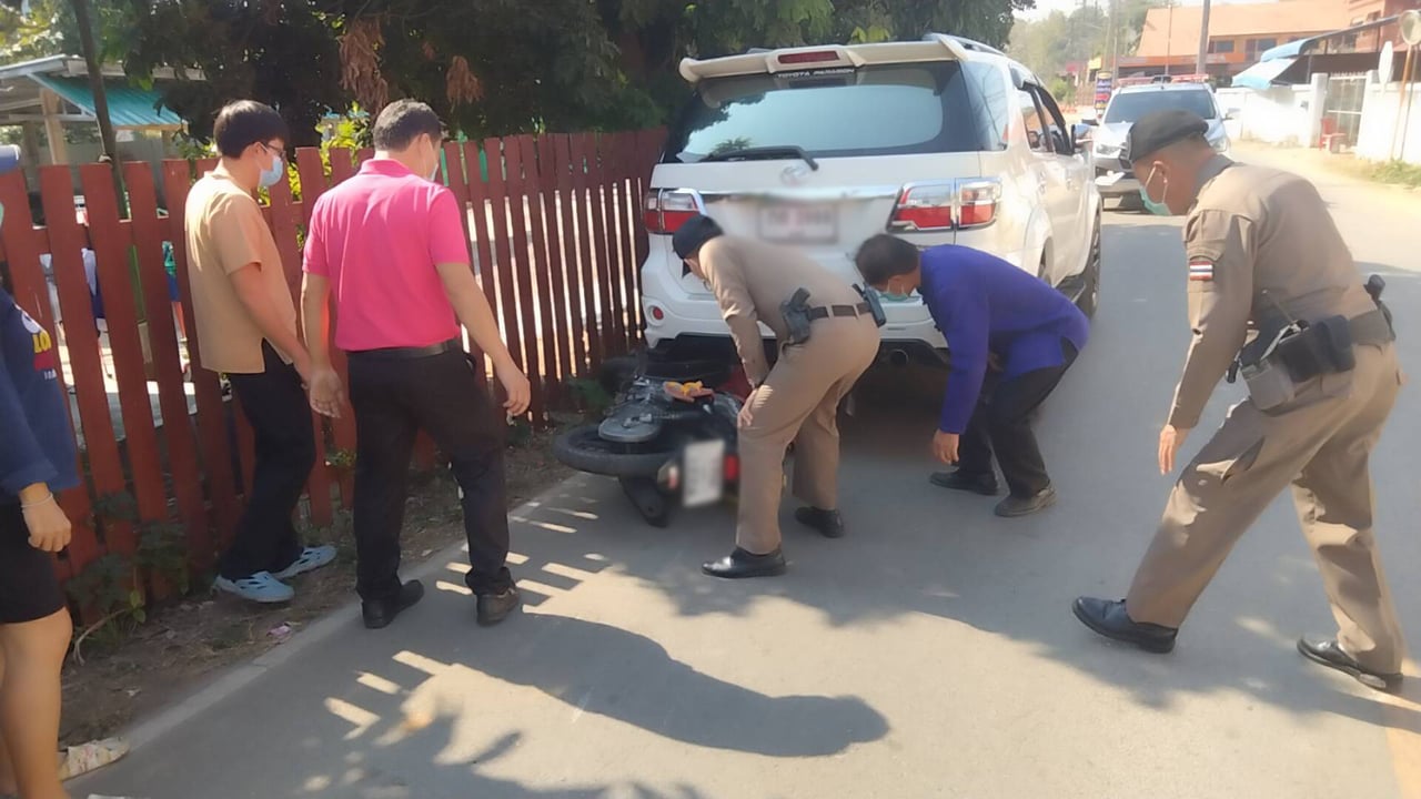 ……เมื่อไปถึงที่เกิดเหตุพบรถจยย.ซุกท้ายรถยนต์โตโยต้าฟอร์จูนเนอร์สีขาว มีผู้ได้รับบาดเจ็บเป็นหญิงสาวจนท.กู้ภัยจึงนำส่งรพ.แพร่เพื่อรักษาตัว