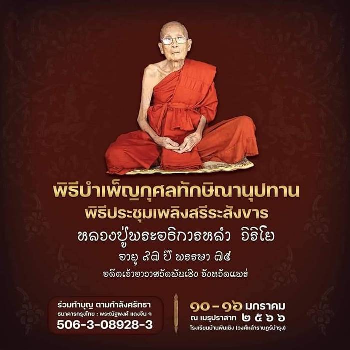 วันที่ 16 ม.ค. 66 เวลา 06.00 น. ทำบุญตักบาตร เวลา 10.00 น. เวลา 7.00 น. ทำบุญตักบาตร พระสงฆ์ สวดถวายพรพระ ณ มณฑลพิธีฯ เวลา 10.00 พิธีบำเพ็ญกุศลสวดพระพุทธมนต์ธัมสังคิณีมาติกาปาฐะและทอดผ้าไตรบังสุกุล พระสงฆ์ทรงสมศักดิ์ เวลา 11.00 น.ถวายภัตตาหารเพล แด่ พระภิกษุ สามเณร เวลา 14.00 น. พิธีบำเพ็ญกุศลสวดพระพุทธมนต์ธัมสังคิณีมาติกาปาฐะและทอดผ้าไตรบังสุกุล พระสงฆ์ทรงสมศักดิ์ เวลา 19.00 น. ทำวัตร สวดมนต์เย็น เจริญจิตภาวนา เวลา 20.00 น. พิธีย่ำปราสาท ตามอริยประเพณีล้านนา เวลา 20.30 น. พืธีประชุมเพลิงสรีระสังขาร พระอธิการหลำ วิริโย