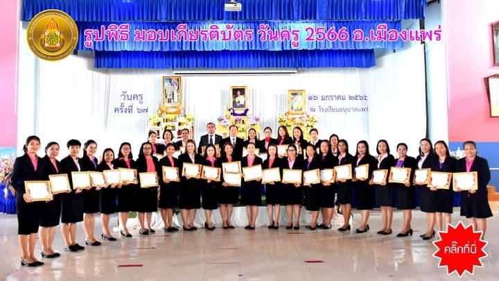 อ.เมือง จัดที่ โรงเรียนอนุบาลแพร่ อมีนายไตรยศ เสรีรักษ์ รอง ผอ.สพป.แพร่ เขต 1 เป็นประธานในพิธีงานวันครู ครั้งที่ 67 ปี พ.ศ.2566 อ.เมืองแพร่ “พลังครู คือหัวใจสำคัญของการพลิกโฉมคุณภาพการศึกษา : Teacher’s Power is the Transforming the Educational Quality” ร่วมพิธีทำบุญตักบาตรข้าวสารอาหารแห้ง พระสงฆ์จำนวน 9 รูป เจริญพระพุทธมนต์ และจัดพิธีถวายผ้าป่า “กองทุนวันครู อำเภอเมืองแพร่” พร้อมทั้งมอบเกียรติบัตรให้แก่ผู้ได้รับรางวัล โดยมี นายวิทูรย์ สินธุวงศ์ ผู้อำนวยการโรงเรียนอนุบาลแพร่ คณะผู้บริหารสถานศึกษา ข้าราชการครูและบุคลากรทางการศึกษา และลูกจ้างสังกัด สพป.แพร่ เขต 1 ร่วมพิธีจำนวนมาก