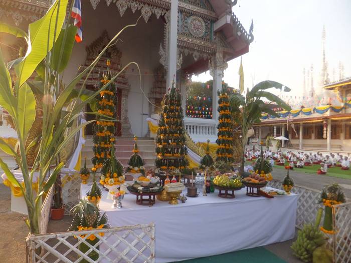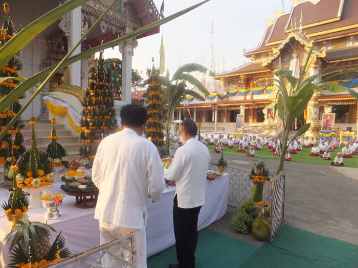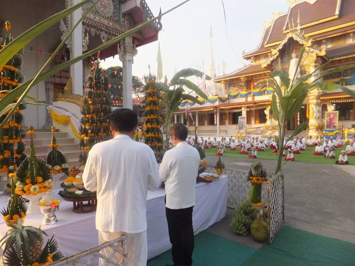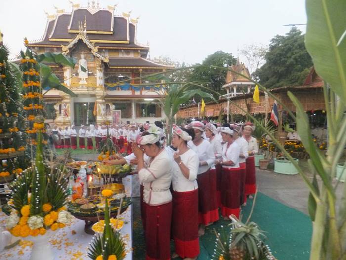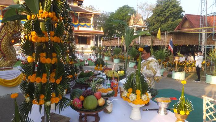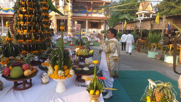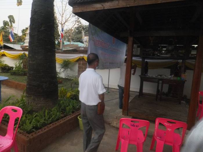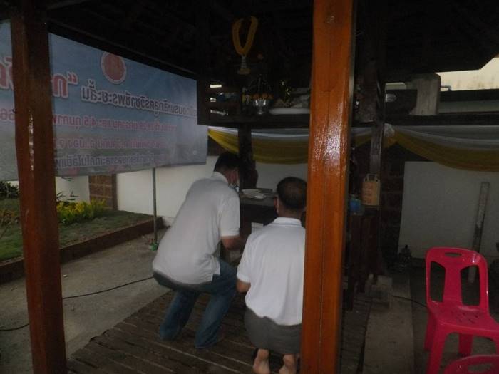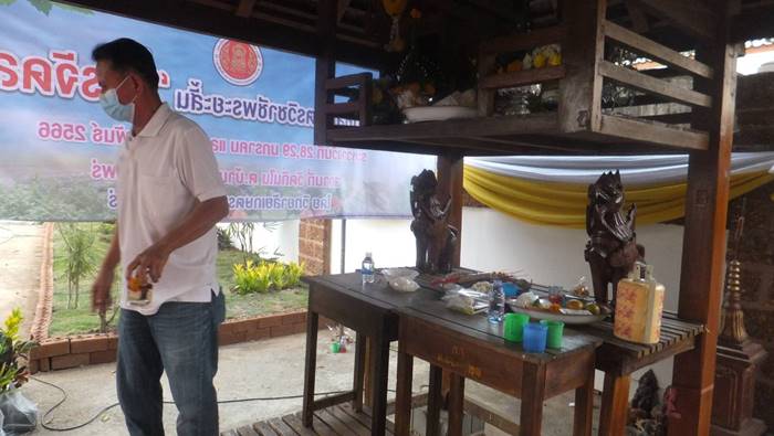 ทางด้านนายสมนึก กันเกา อายุ 67 ปี ผู้ช่วยผู้ใหญ่บ้าน หมู่ 5 ต.บ้านถิ่น และเพื่อนกรรมการวัดได้นำธูปเทียนมาบอกกล่าวเจ้าที่ ซึ่งติดทางด้าน รร.บ้านถิ่น (ถิ่นวิทยาคาร) ขอขมาลาโทษ โดยนายสมนึก เล่าว่า ผู้ที่ป่วยสักครู่เป็นลูกน้องของเจ้าของเครื่องเสียงที่มาติดตั้งในงานมาทำงาน ได้ 2 วัน ตอนบ่ายตนยังเห็นดีๆไม่มีทีท่าว่าจะเป็นอะไร เมื่อมีการทำพิธีบวงสรวงไปได้สักครูที่ ก็พบว่า เห็นนอนหนาวสั่น ไม่ได้สติจึง แจ่ง อสม.ให้ช่วยเหลือจะเป็นเพราะเจ้าแรงหรือเกิดจากอะไรที่คาดเดาได้ และพิธีบวงสรวงท้ายสุดคือการห้อยของชาวไตลื้อบ้านถิ่น 200 ชีวิต